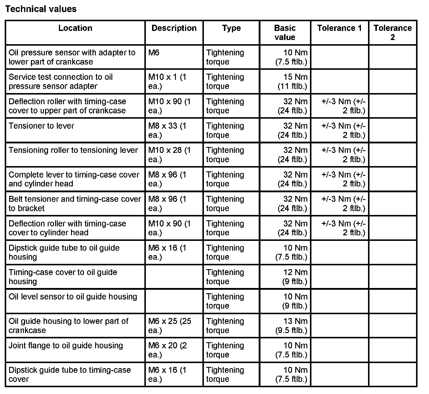 3 - Screw, M8 x 96; complete lever to timing-case cover and cylinder head - Tightening torque: 32 Nm (24 ftlb.)±3 Nm (±2 ftlb.); belt tensioner and timing-case cover to bracket - Tightening torque: 32 Nm (24 ftlb.)±3 Nm (±2 ftlb.)