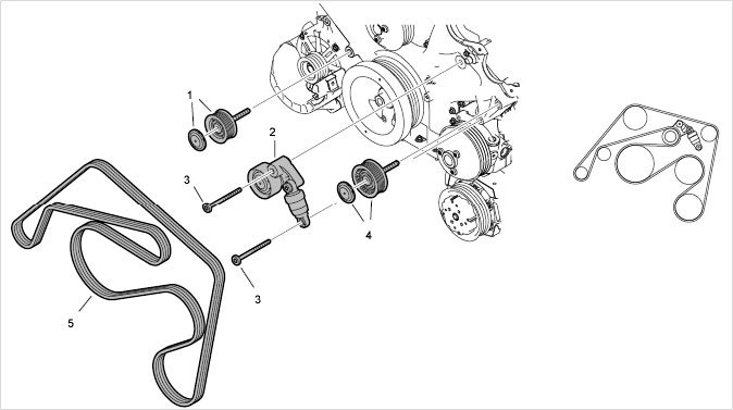 2 - Hydraulic belt tensioner; tensioner to lever - Tightening torque: 32 Nm (24 ftlb.)±3 Nm (±2 ftlb.); tensioning roller to tensioning lever - Tightening torque: 32 Nm (24 ftlb.)±3 Nm (±2 ftlb.)