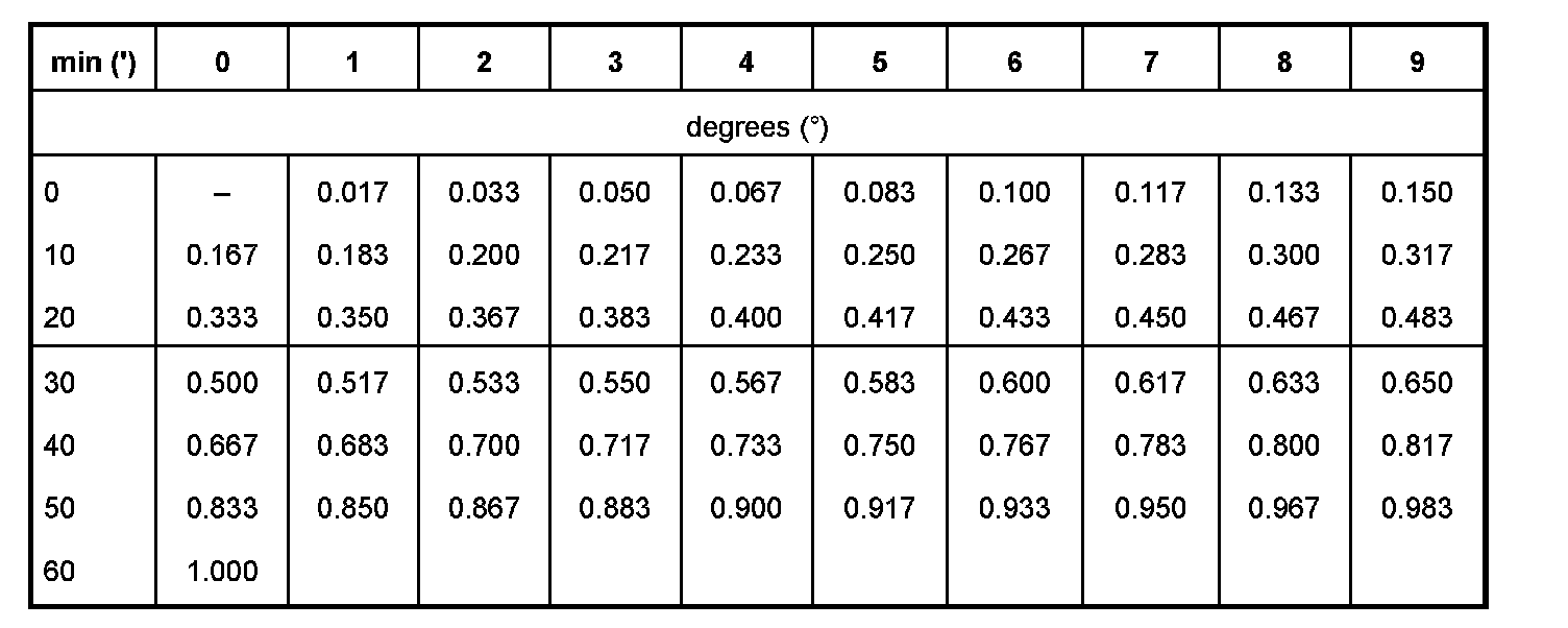 - Example 1: toe 0.350 decimal degree = 21 min (21'). A search is performed for the decimal value (0.350) in the table. The co-ordinates are then formed from this point/value. Line to the left = 20' and line upwards = 1' (which equals 20'+ 1').