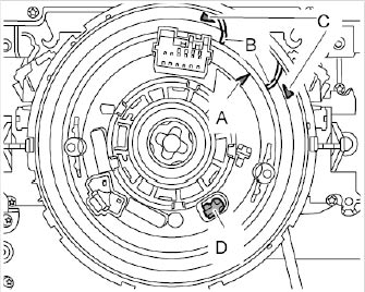 - Ensure that arrow -A- of the rotor is positioned between the markings -B- of the arrows -C- of the airbag contact unit and that the locking element -D- is engaged.