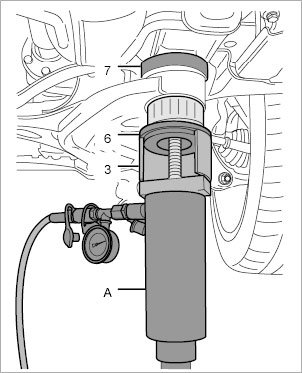 8. Press in suspension subframe bearing. To avoid damaging the bearing, the maximum - Pressure: 10 kN±5 Second must not be exceeded at the stop (10 KN = 350 bar). This conversion applies only to the hydraulic cylinder VAS 6178. The conversion depends on the diameter of the cylinder in question.