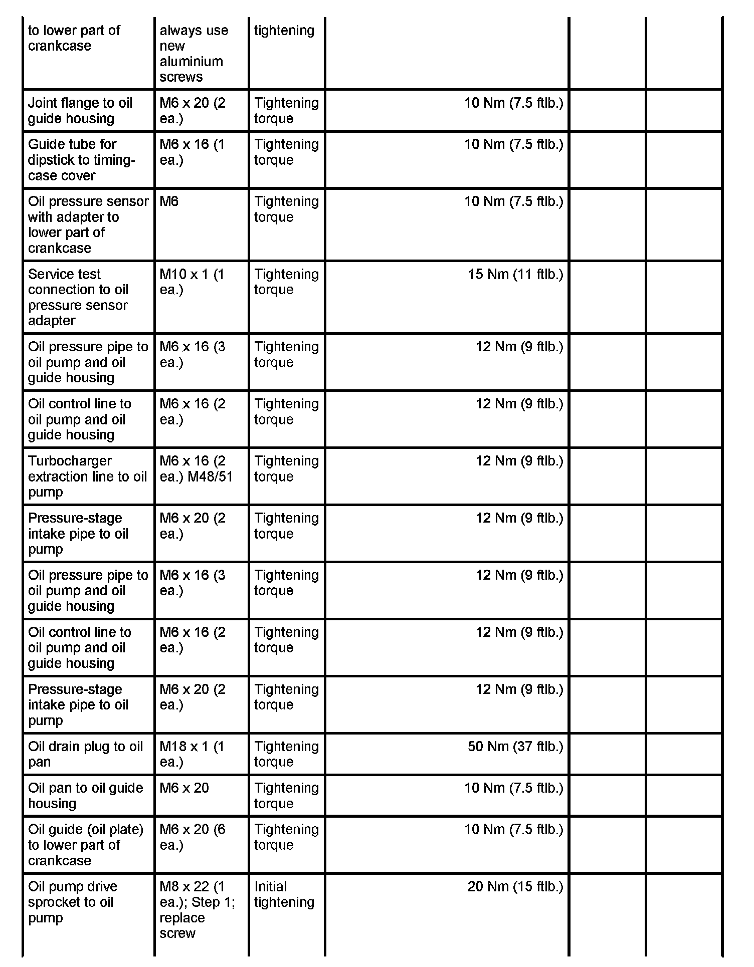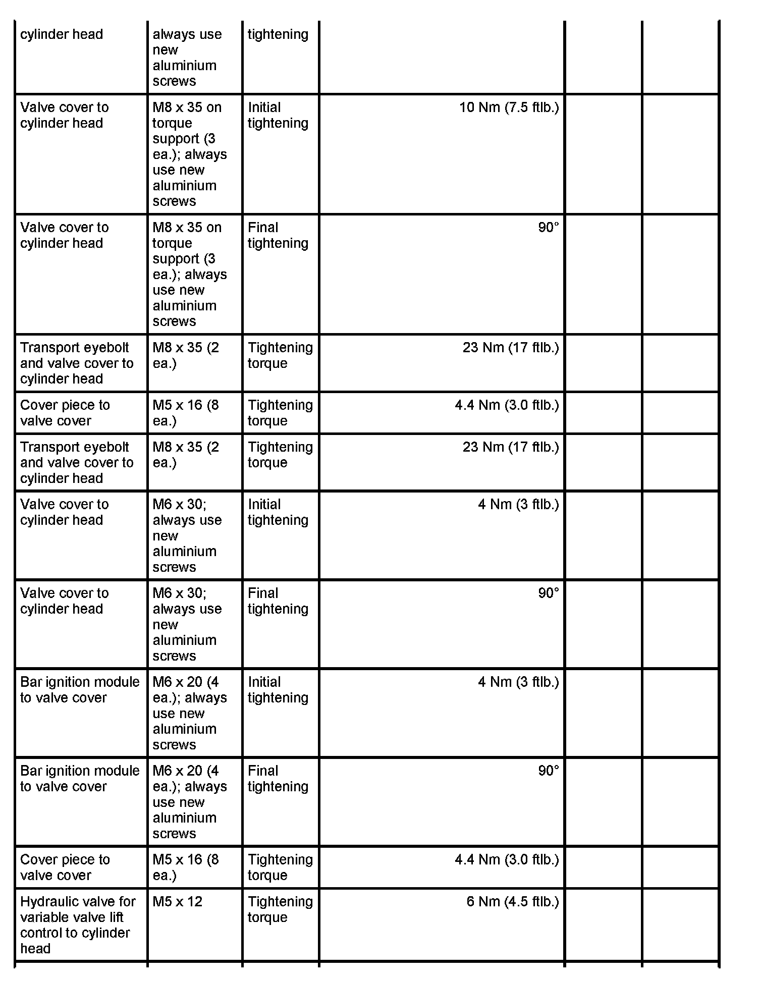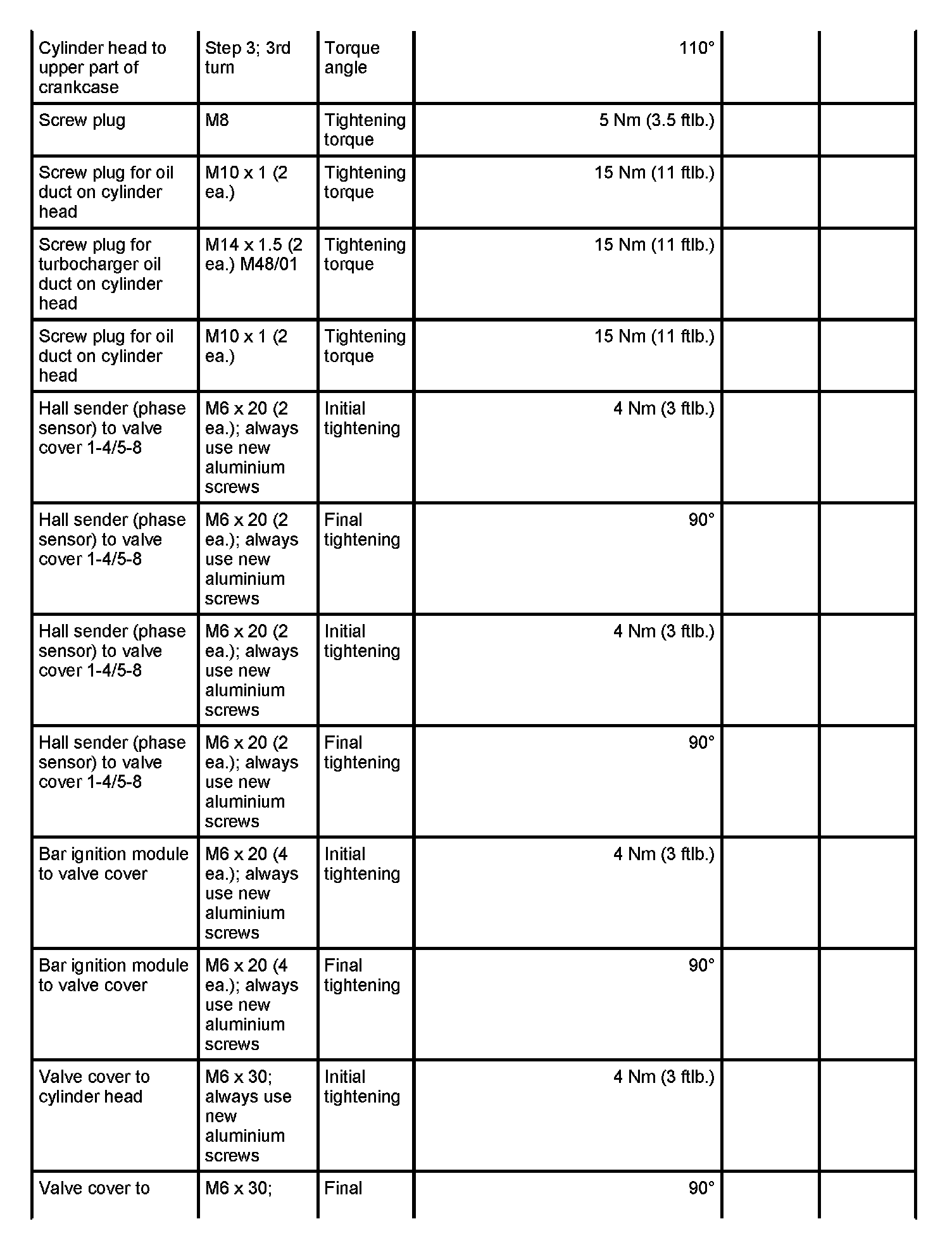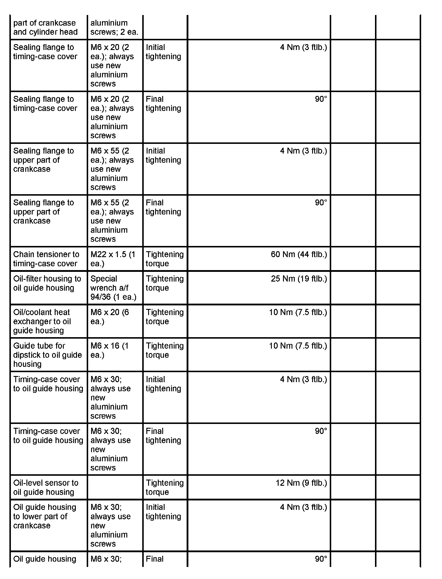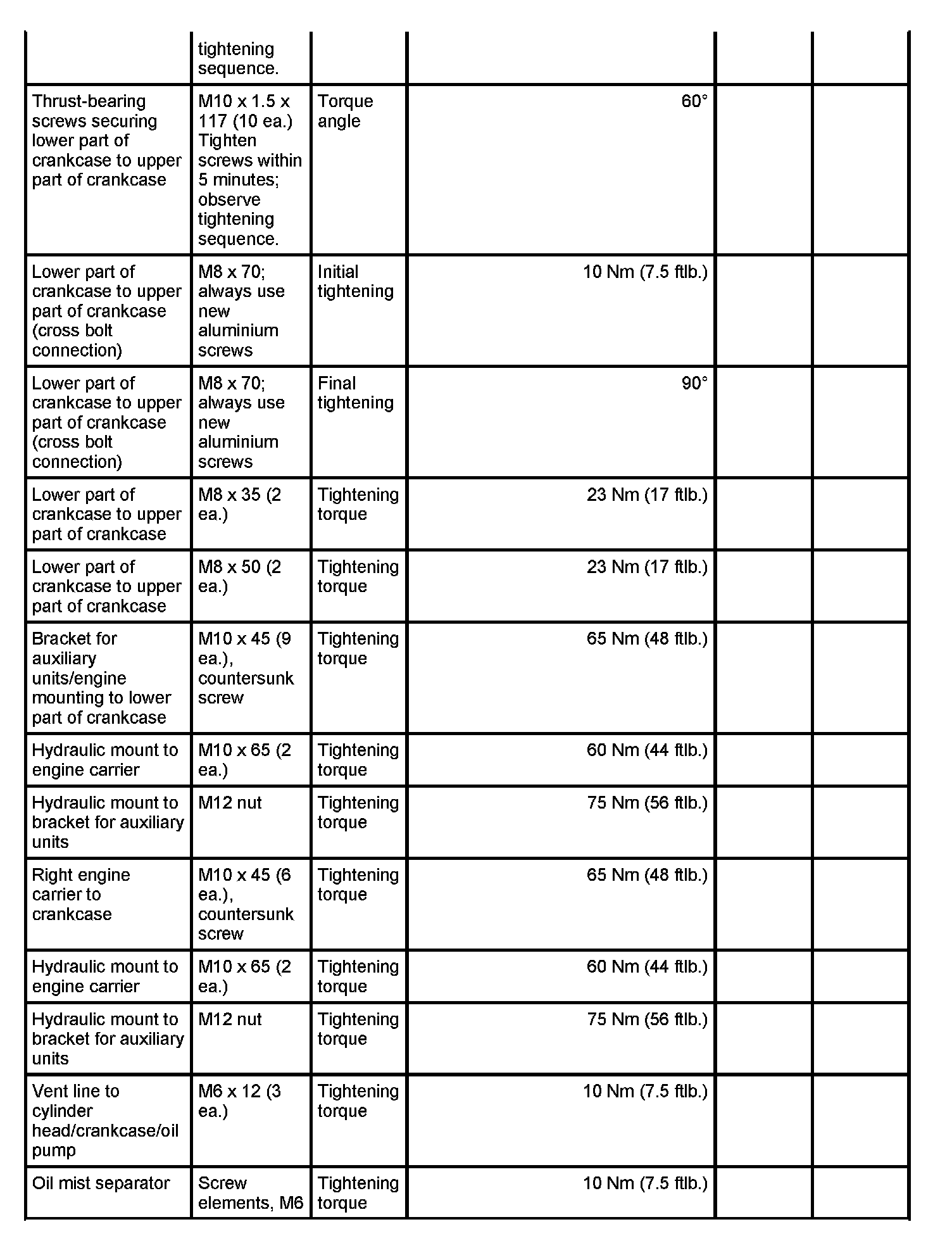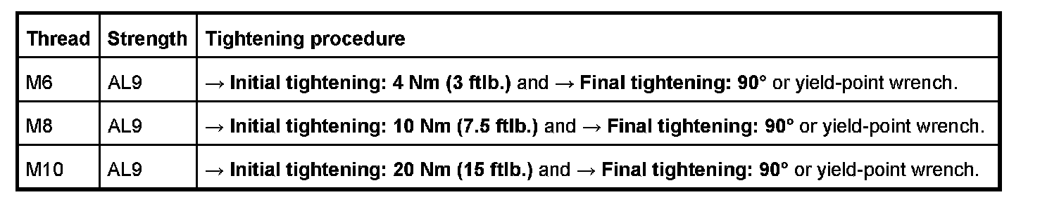 7 - Aluminium screw, M8 x 70; (cross bolt connection); always use new aluminium screws; observe tightening sequence as for steel screws - Initial tightening: 10 Nm (7.5 ftlb.) and - Final tightening: 90 degrees