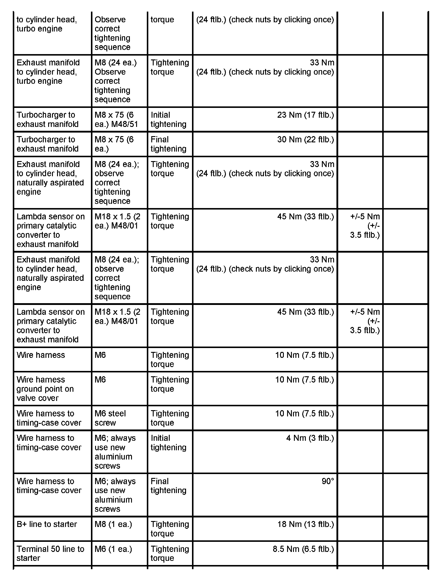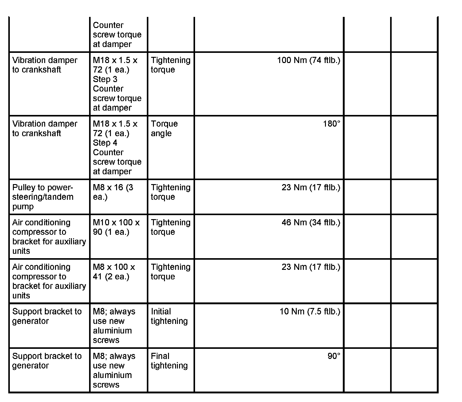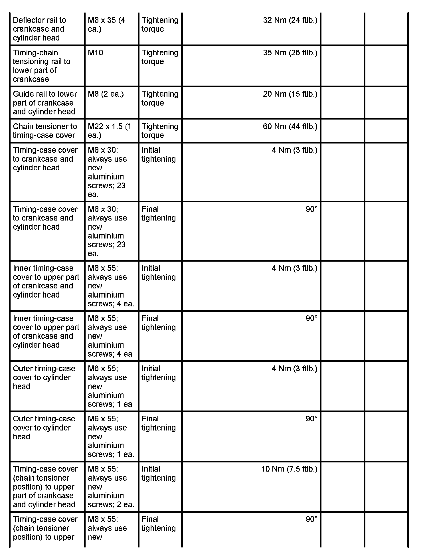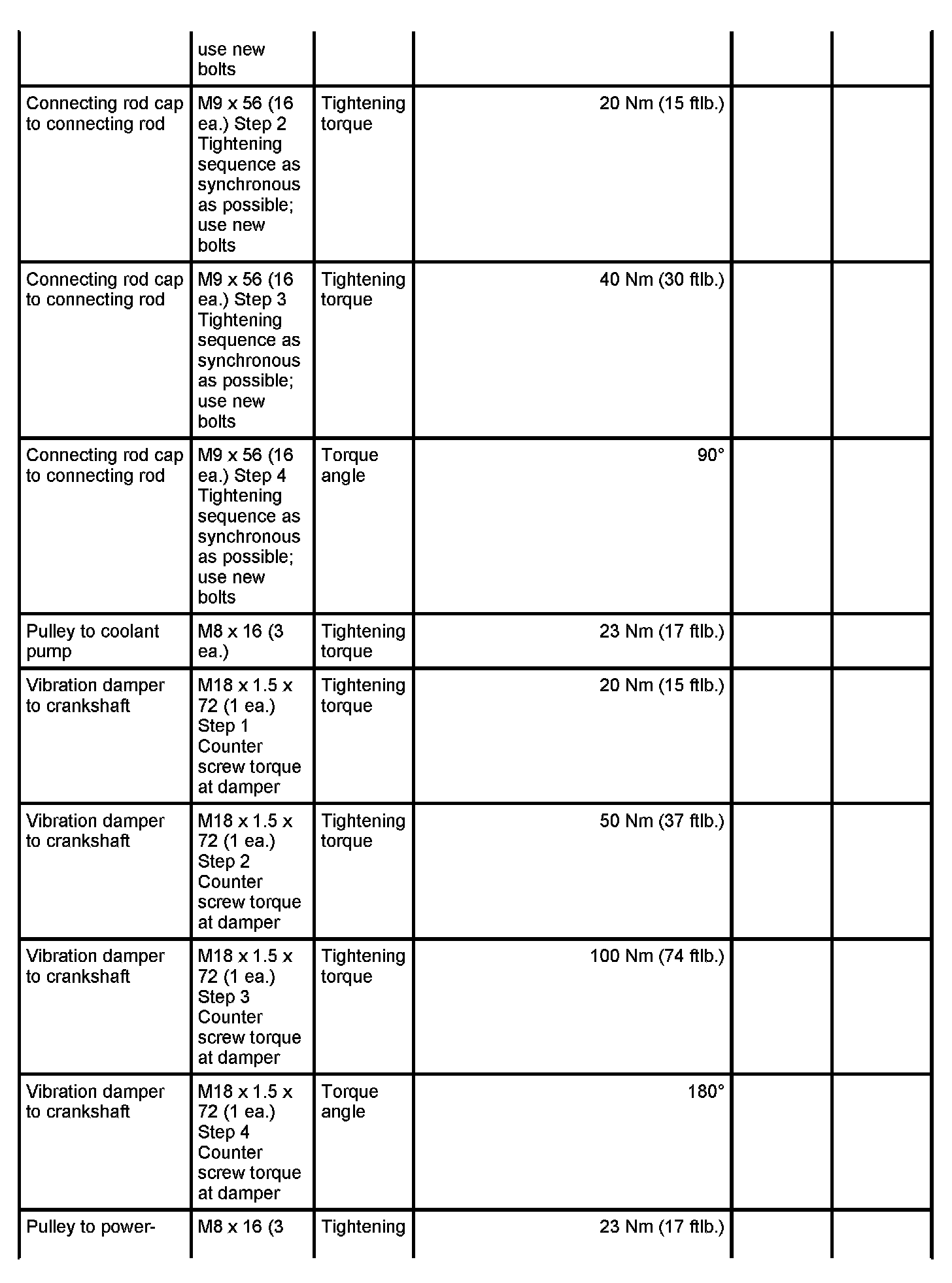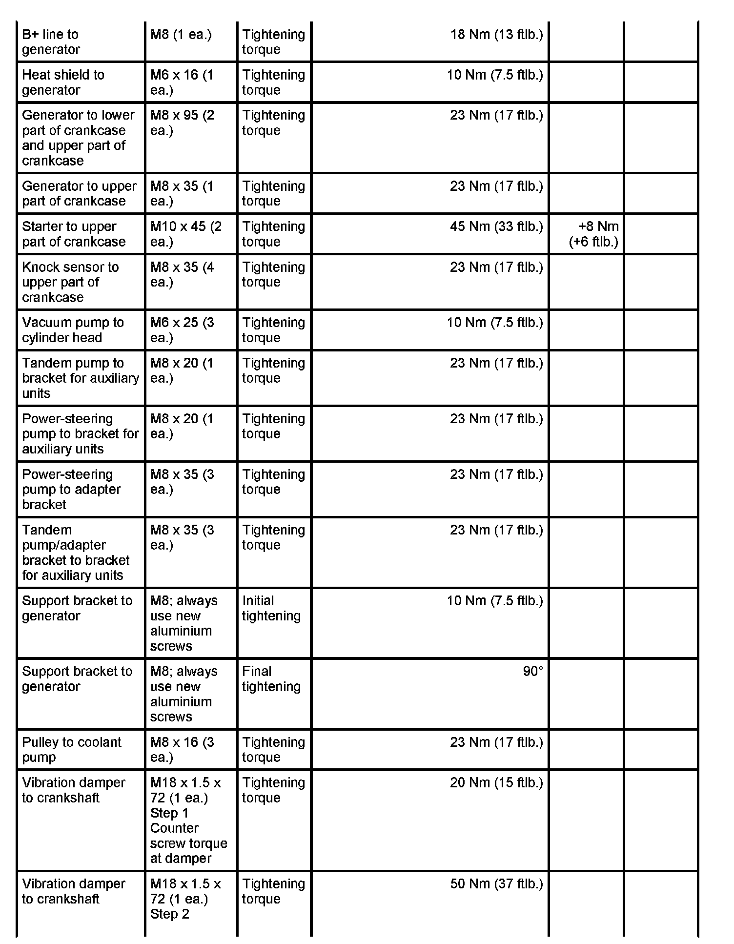 7 - Aluminium screw, M8 x 70; (cross bolt connection); always use new aluminium screws; observe tightening sequence as for steel screws - Initial tightening: 10 Nm (7.5 ftlb.) and - Final tightening: 90 degrees