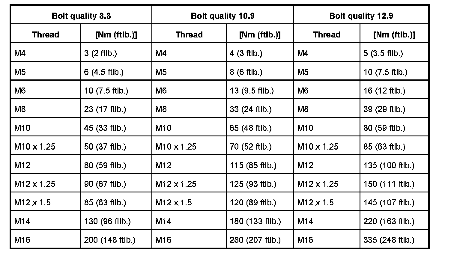 The torques in the table below generally apply to screws that are not specifically listed