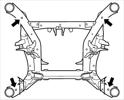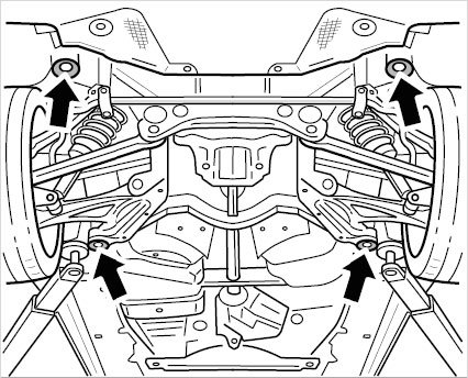 12. Push into the take-up points -arrows- provided. The -arrows- show the take-up points for the mounting frame in the rear axle housing (view from below here).