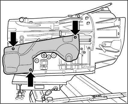 4. Install shield on the transmission. To do this, screw in three fastening screws -Arrow-. -> Tightening torque: 10 Nm (7.5 ftlb.)