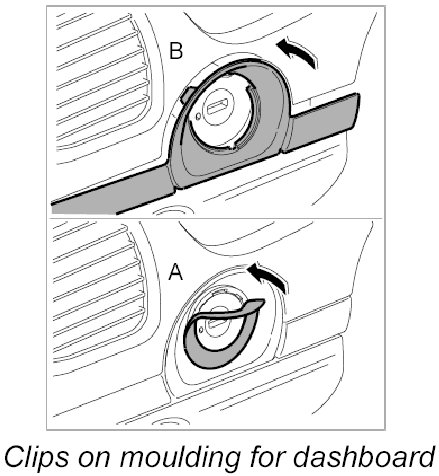 2. Carefully unclip moulding for dashboard -arrow B- with a plastic spatula. Observe the two upper lugs when doing do.