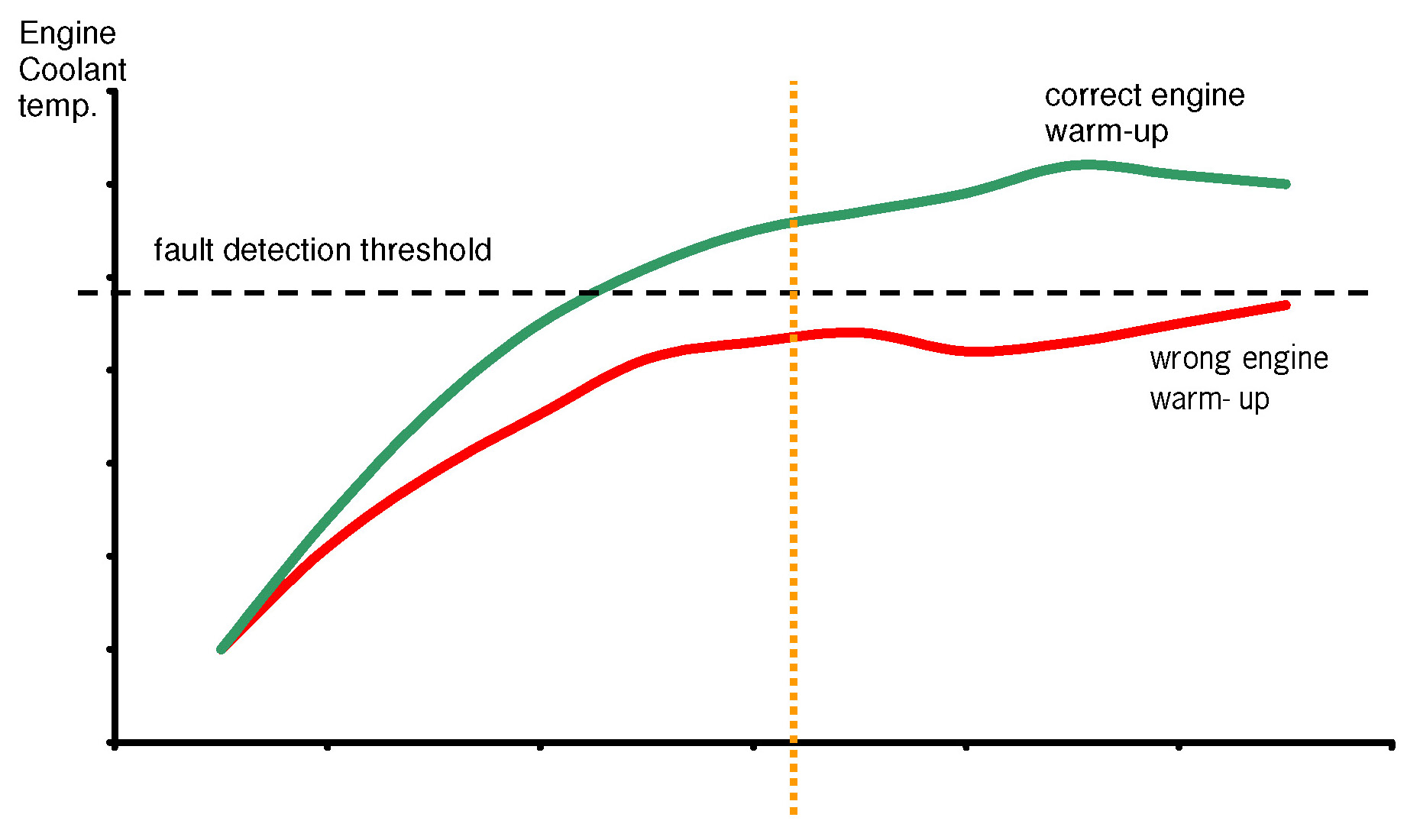 If under normal driving conditions the ECT signal is below this threshold a malfunctioning coolant thermostat is detected.