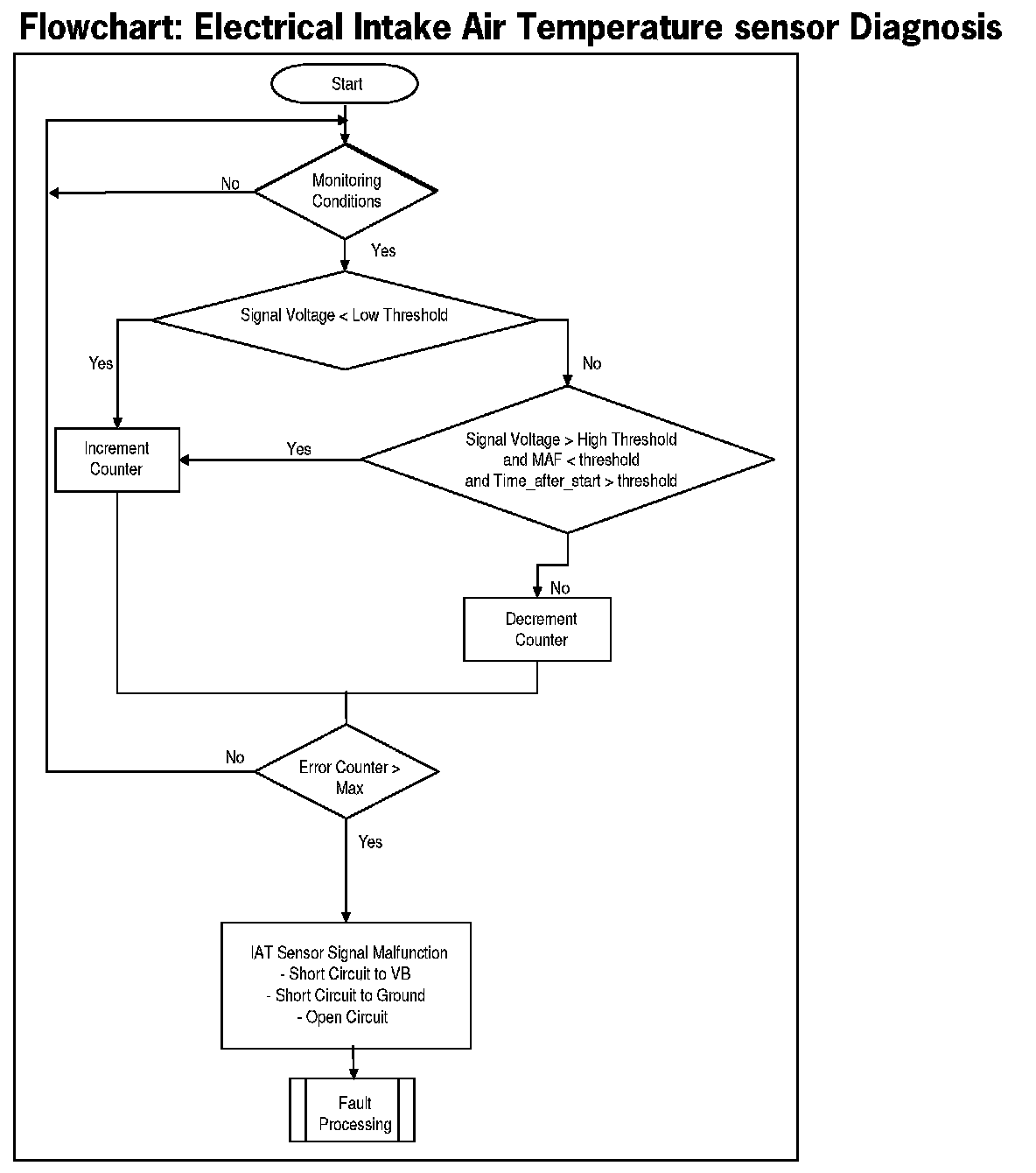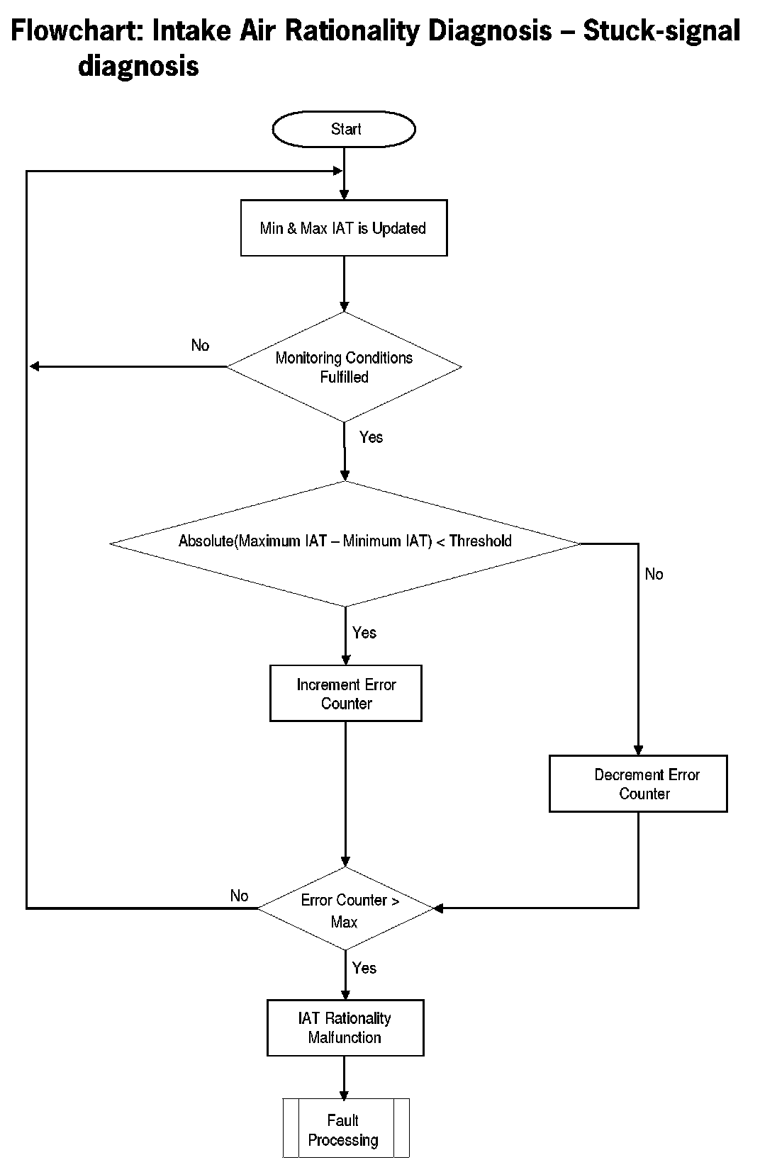 This diagnosis checks IAT for a Stuck signal. If the vehicle was driven for a minimum required distance and time-after-start, then the change in the IAT signal during this period should be above a calibrate able threshold. If this is not the case, a stuck IAT signal is detected.