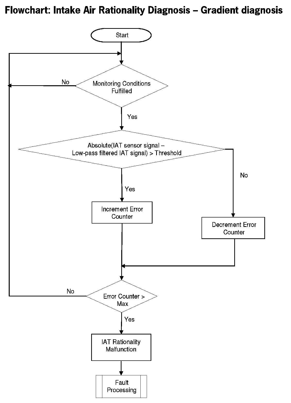 The purpose of this diagnosis is to detect an implausible gradient on the intake-air-temperature sensor signal. The diagnosis checks whether the difference between the measured IAT value and a low-pass-filtered (PT1) IAT signal exceeds a calibrate able threshold. If this is the case, a intermittent IAT signal is detected.