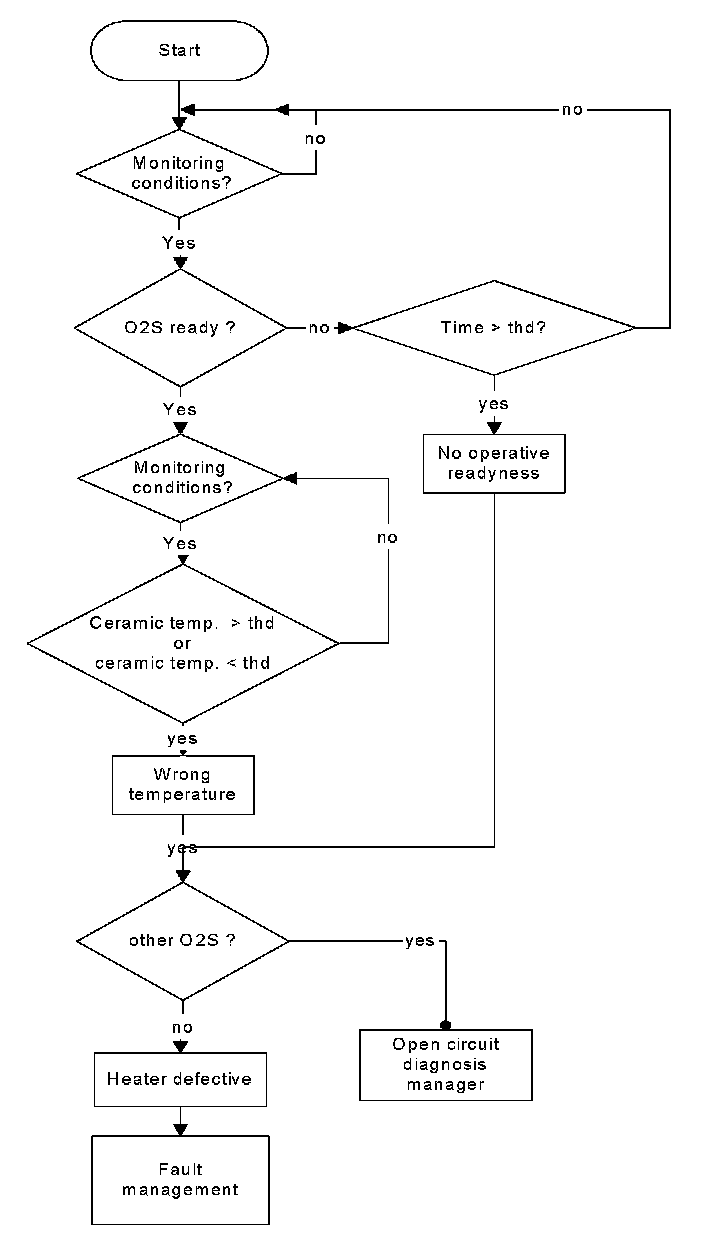 After O2S readiness, the ceramic temperature is continuously monitored for an upper and lower threshold. If the ceramic temperature exceeds one of the thresholds and no other O2S failure exists, the heater is defective and the failure management is triggered. If other O2S failures exist, the diagnosis result is handed over to the open circuit diagnosis manager.