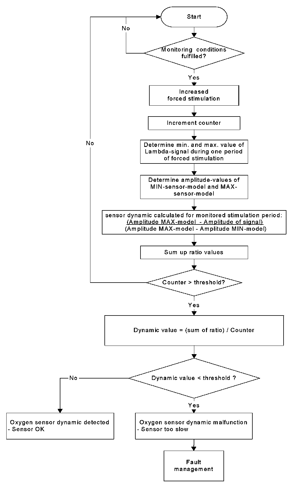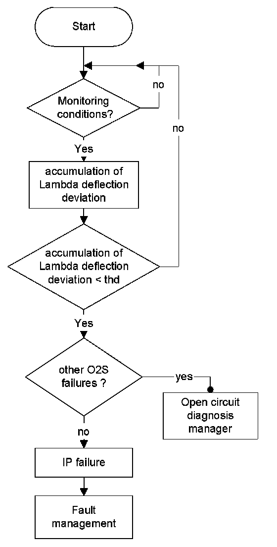 The purpose of this function is to detect an insufficient deflection of the O2S signal. For a time period the lambda deflection is accumulated and has to exceed a threshold. If the threshold is not exceeded, the diagnosis result is handed over to the open circuit diagnosis manager.