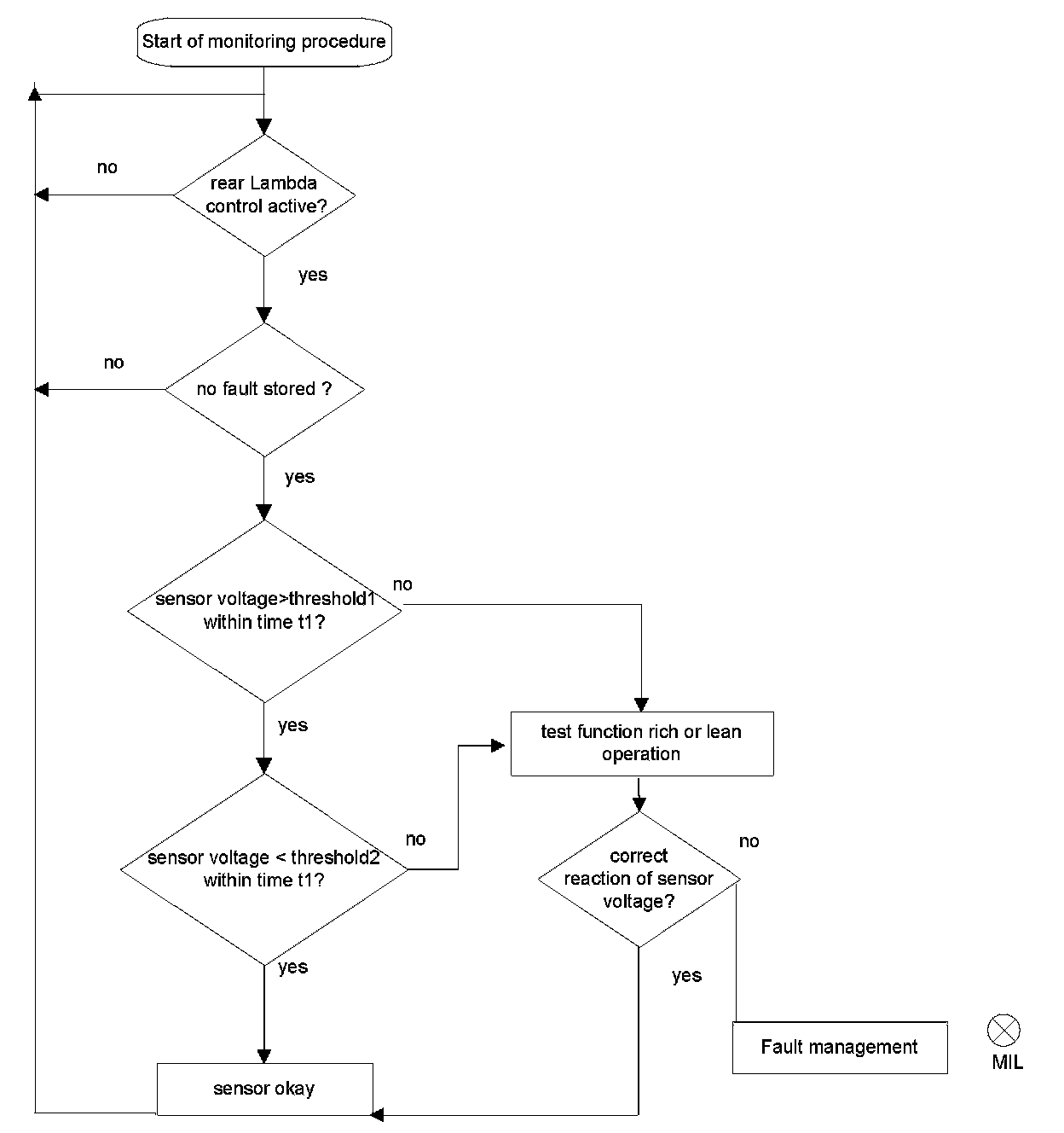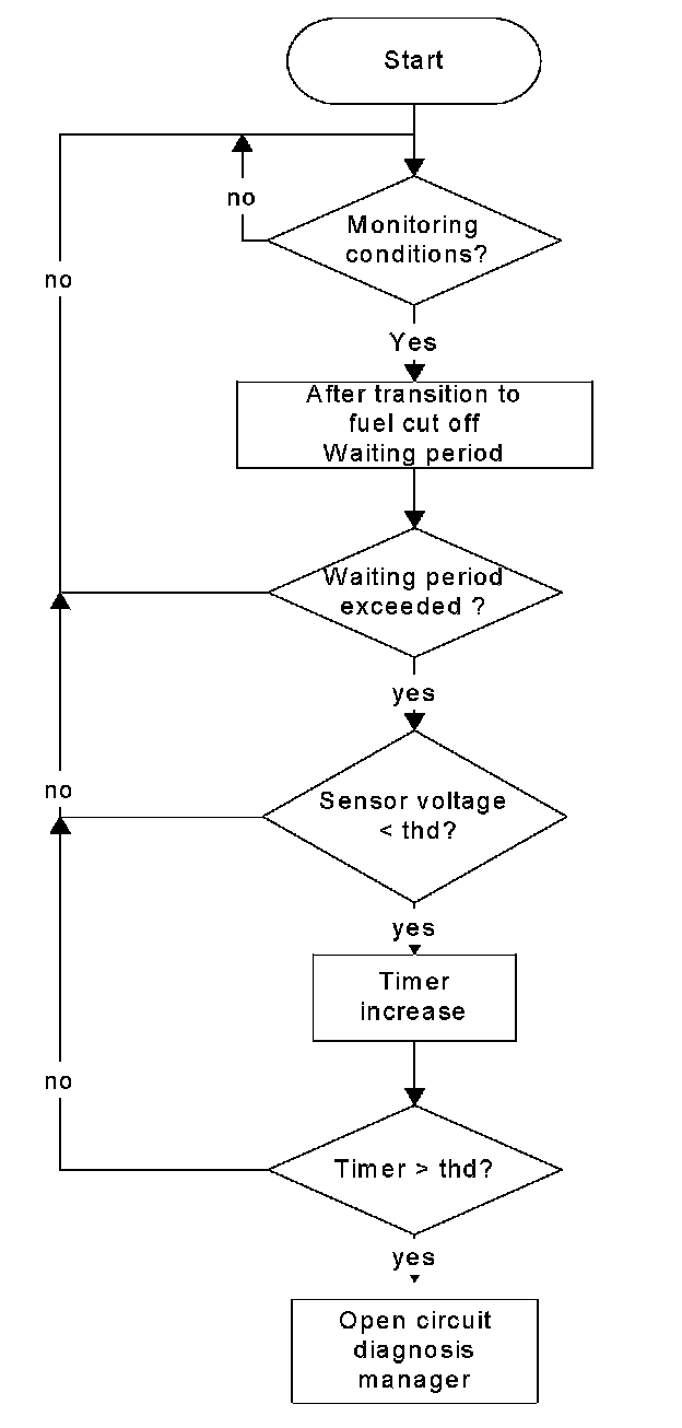 The oxygen sensor signal monitoring during fuel cut-off detects if the oxygen sensor signal is below a defined range. The diagnosis result is handed over to the open circuit diagnosis manager.