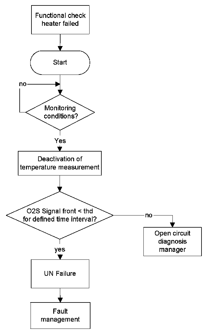 If the functional check for the heater has detected a failure, the oscillator of the O2S controller (ATIC 42) used to measure the sensor internal resistance is disabled in order to allow a more detailed error detection. Does the O2S signal falls below a threshold for a certain time during the defined diagnosis period it is an indicator for a broken VN-line. In any case the result of this test is handed over to the open circuit diagnosis manager either to enter the failure in the error management or to proceed with further diagnostics.