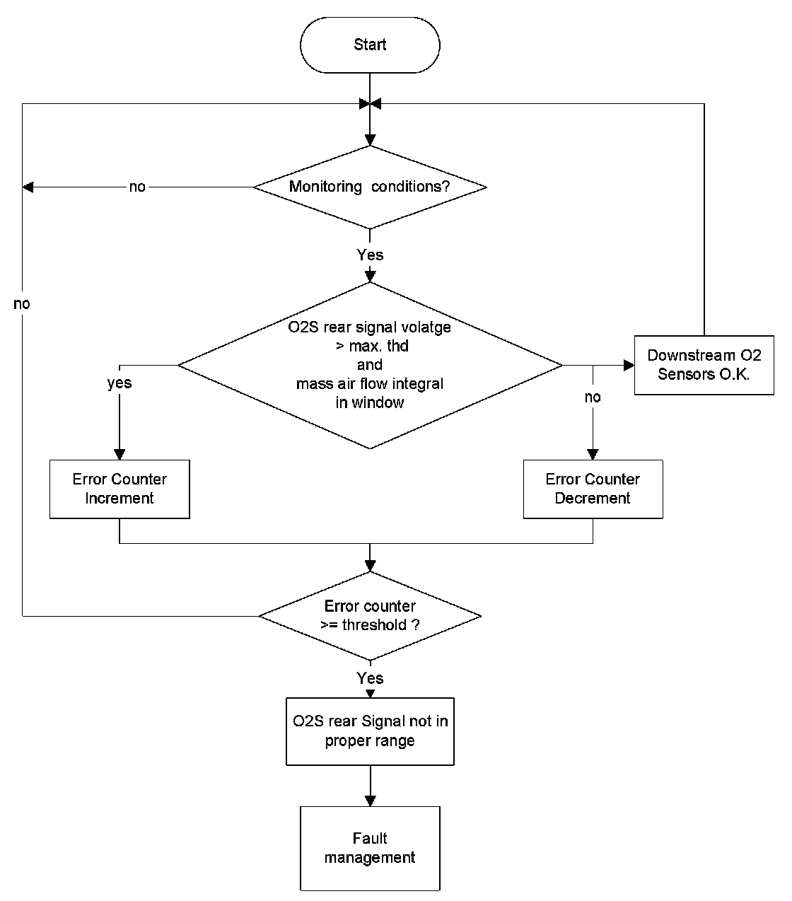 The purpose of this diagnosis is to determine character shift down or up of the O2S front. If the O2S rear indicates rich conditions and lambda controller deviates to rich side but O2S front signal remains on the lean side then a character shift down malfunction of the O2S front is detected.