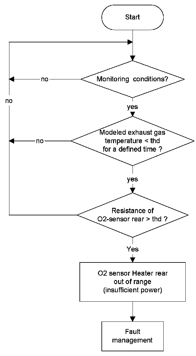 The purpose of this diagnostic is to determine insufficient power of the heater for the downstream O2-sensor. It is monitored whether the resistance of the rear O2-sensor is below a threshold. If not, the heater has insufficient power.