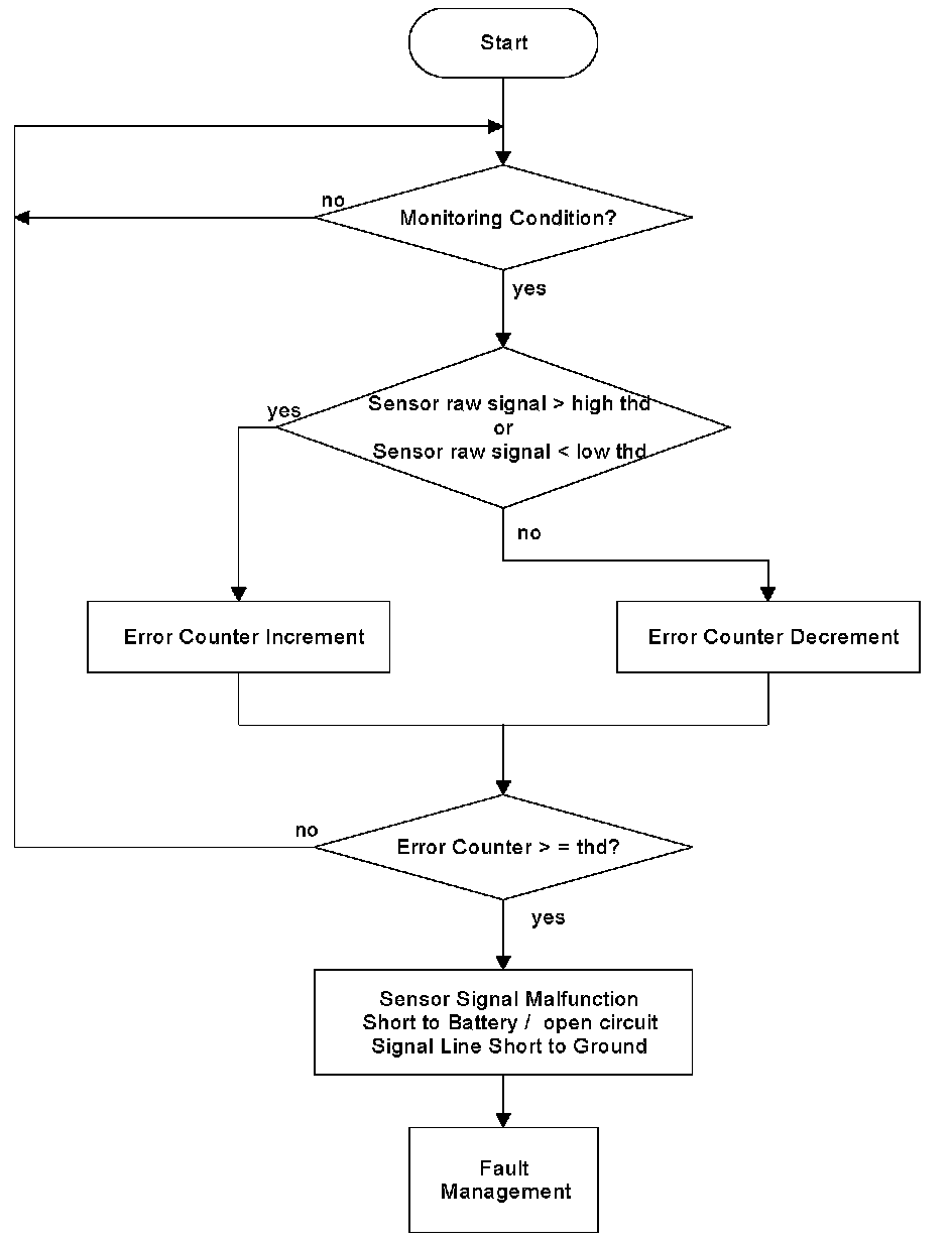 Sensor signals out of a defined range are regarded as circuit malfunctions shorted to battery plus, shorted to ground or open circuit.