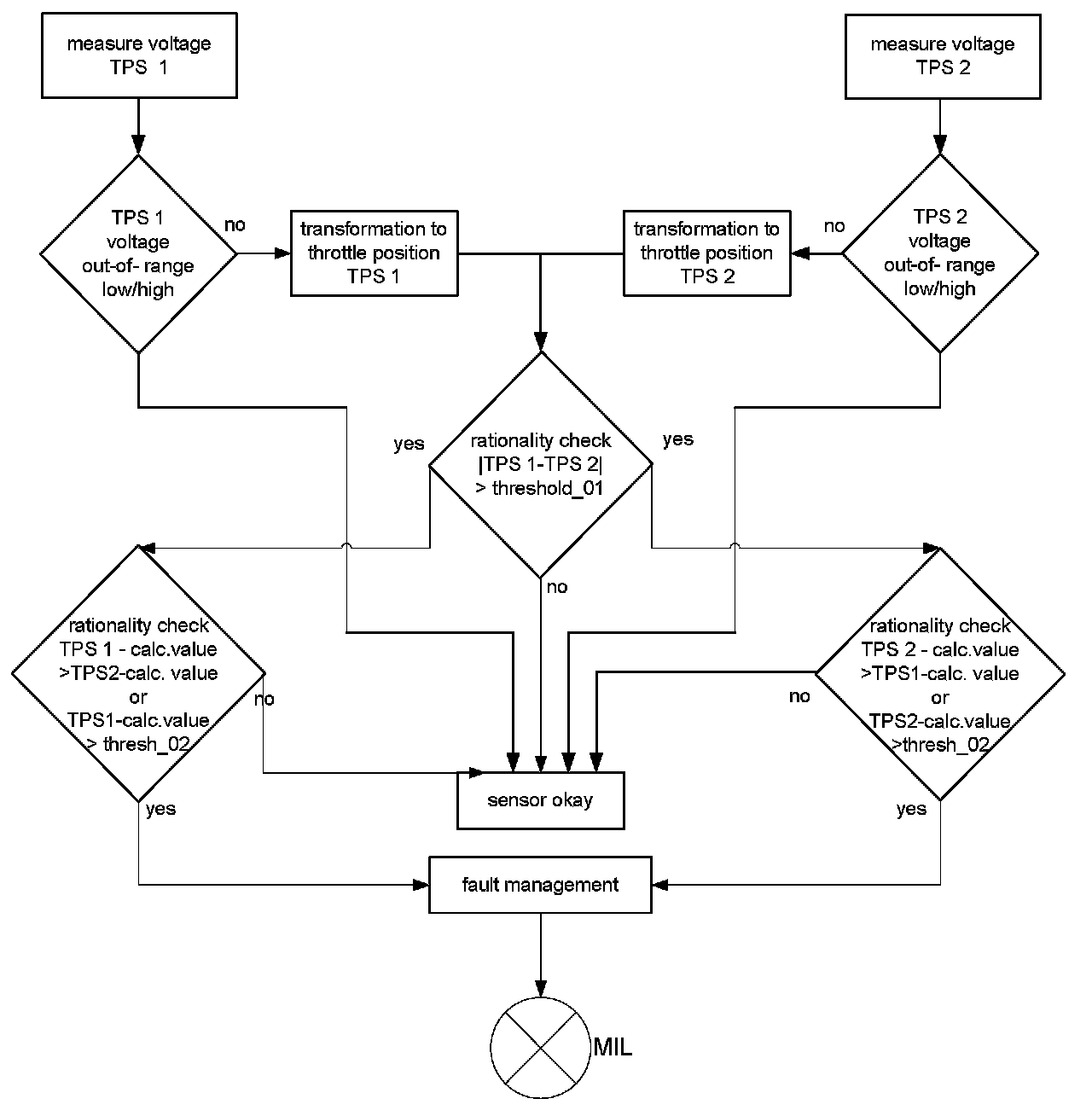 The diagnostic monitors the corrected values of potentiometer 1 and 2. In the case of a higher difference than a threshold value both signals are compared to the engine load to determine and disable the faulty one. A fault code will be stored and the MIL will be illuminated.