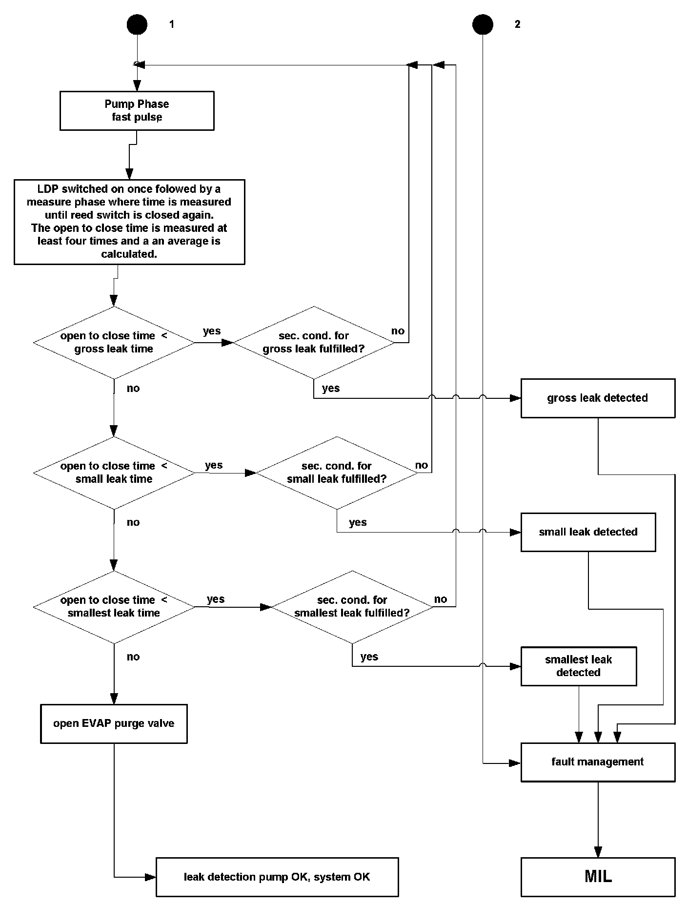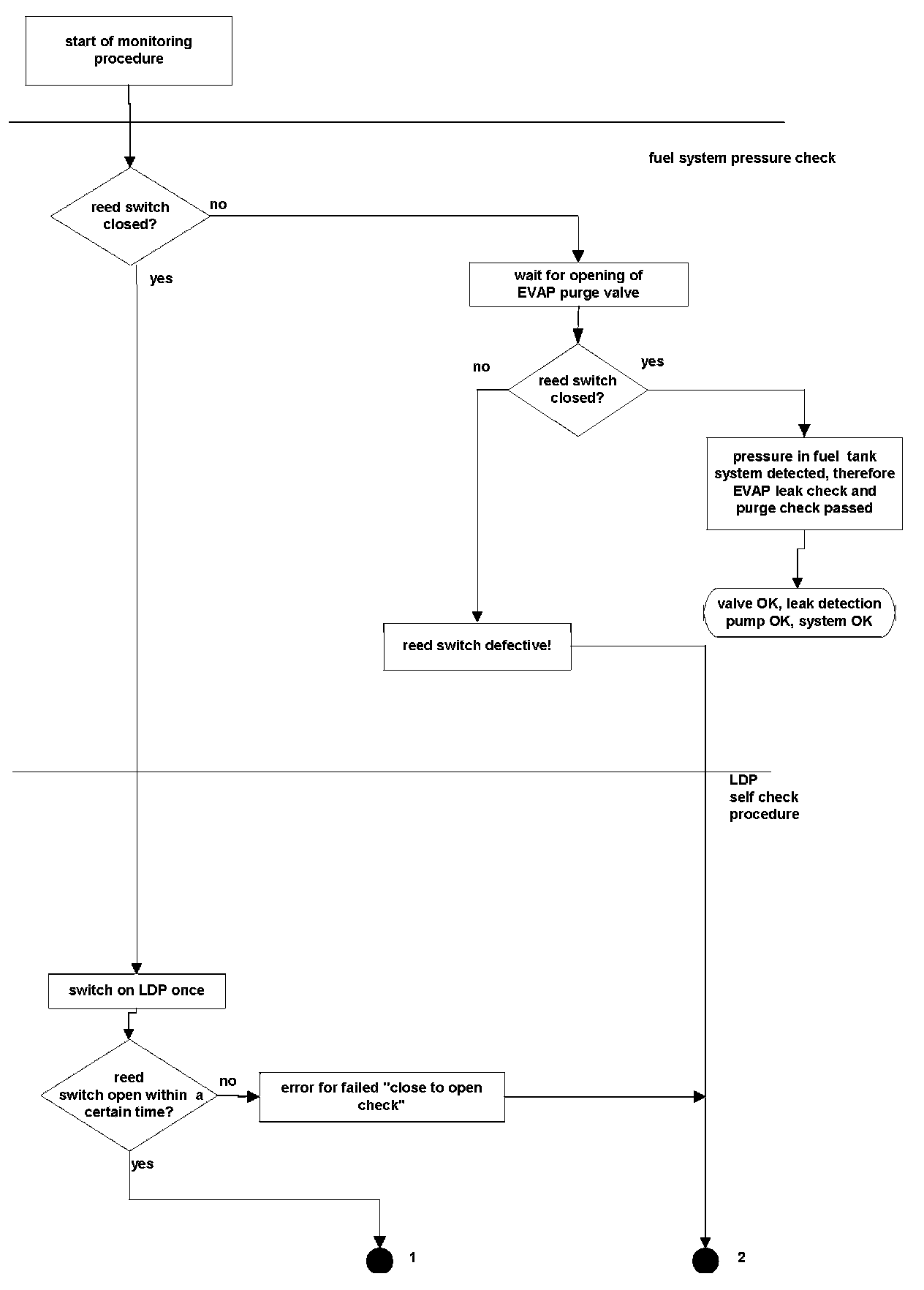 The first step of leakage diagnostics is the pressure check of fuel tank system by testing the reed switch. In case of an open reed switch, the fuel tank system has sufficient pressure for the sealed check and no further pressure has to be supplied to the fuel tank system by the LDP.
