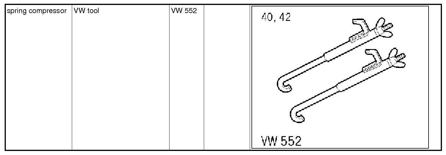 7. Fix upper axle struts with spring compressor VW 552. This involves tensioning the axle strut slightly because otherwise the top ball joint can be damaged. When doing this, engage the -connecting piece- into the top opening of the wheel well (double panel, under the wheel housing cover) and into the axle strut (do not disconnect the air spring connection.).