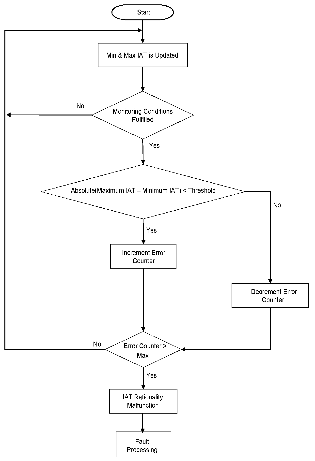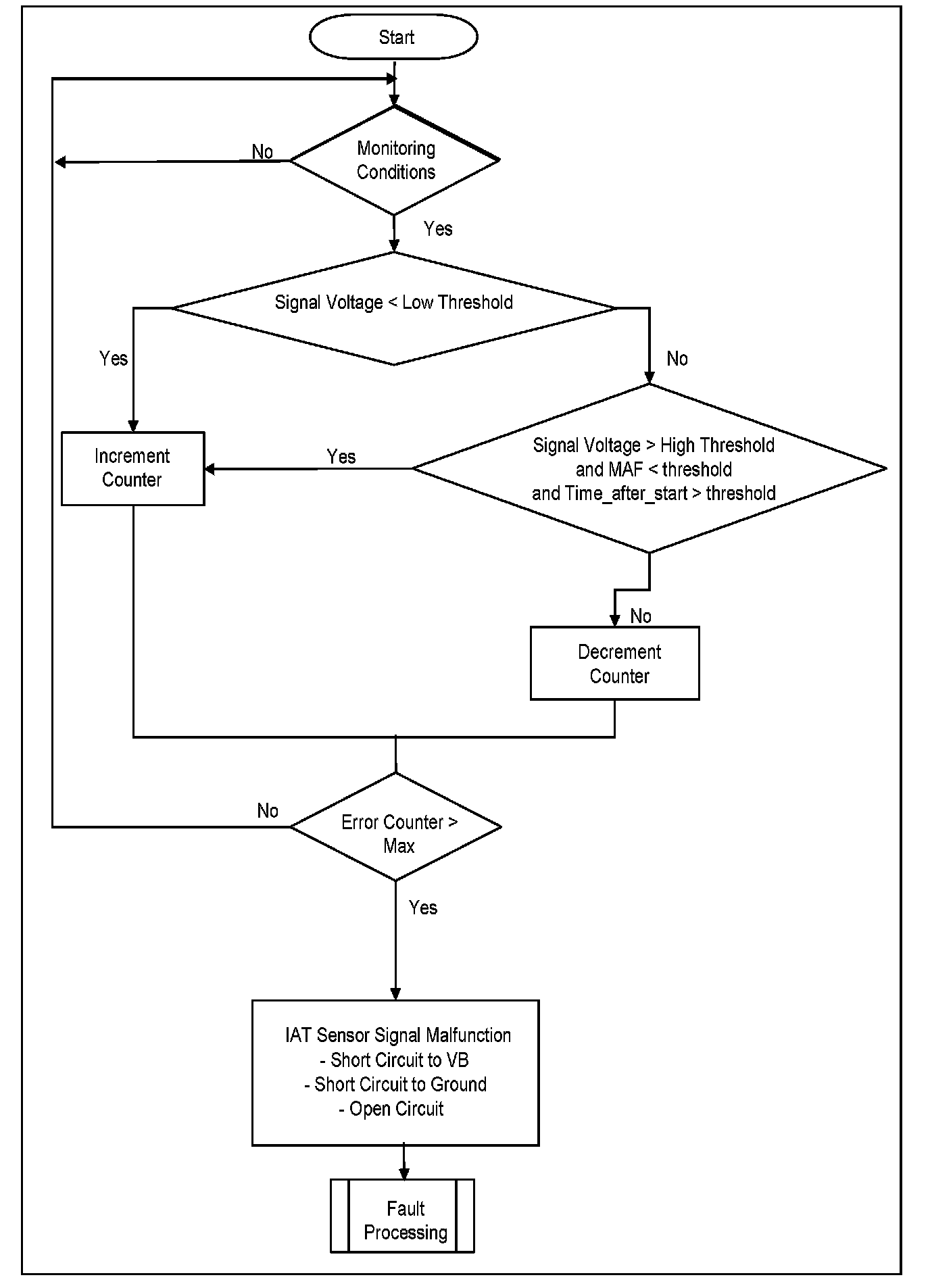 This diagnosis checks IAT for a Stuck signal. If the vehicle was driven for a mini-mum required distance and time-after-start, then the change in the IAT signal during this period should be above a calibrate able threshold. If this is not the case, a stuck IAT signal is detected.
