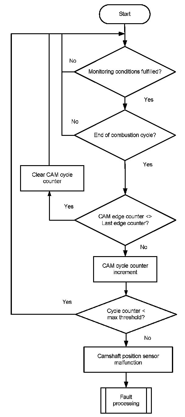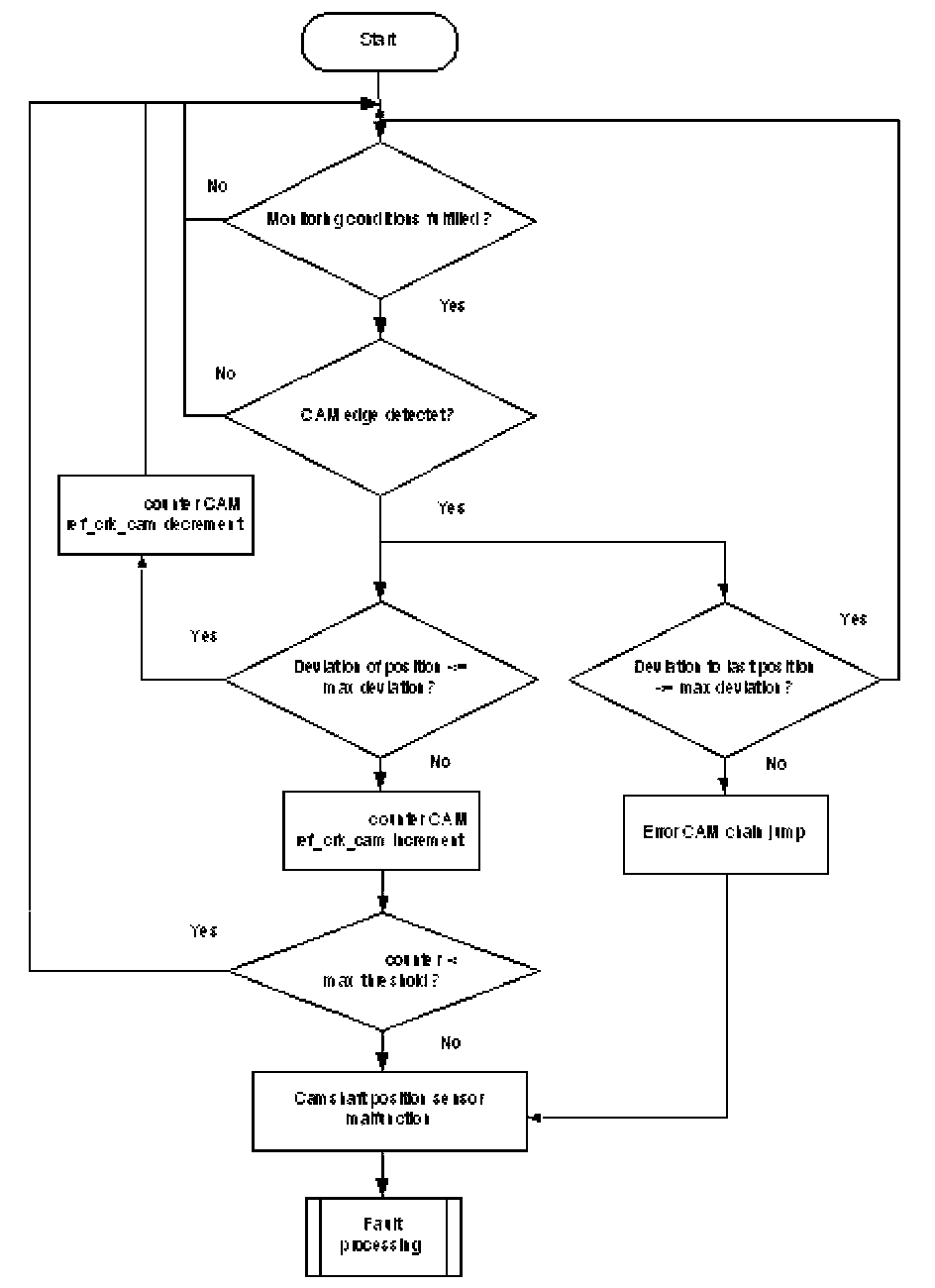 The monitor checks once per combustion cycle the edge counter of the camshaft. If the edge counter has not changed during the last cycle, a cycle counter is incremented. When the counter reaches a threshold, the error CAM_plaus is delivered to the error management.