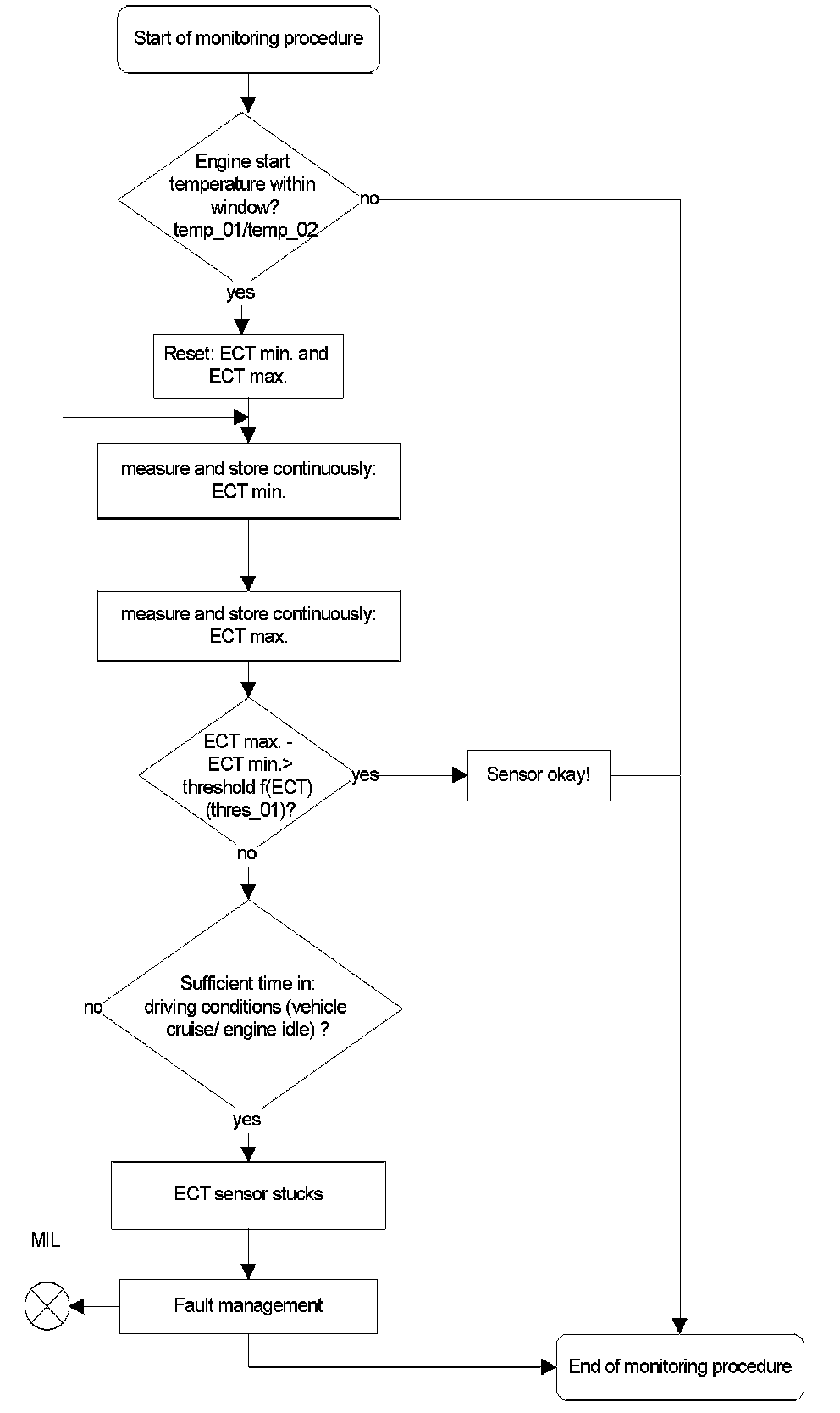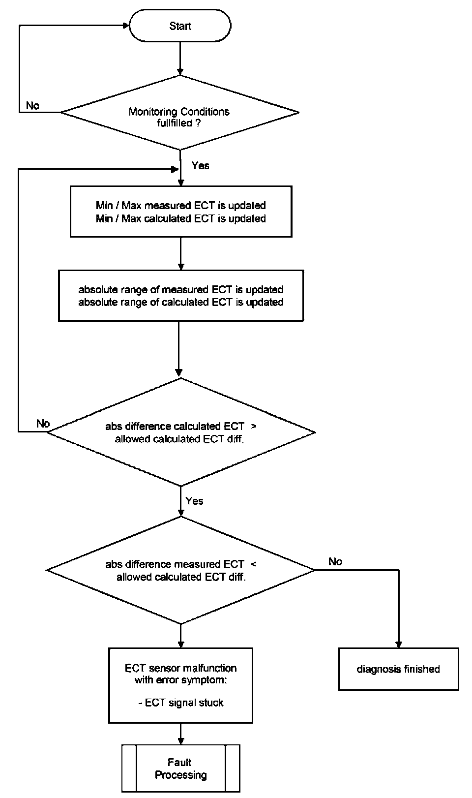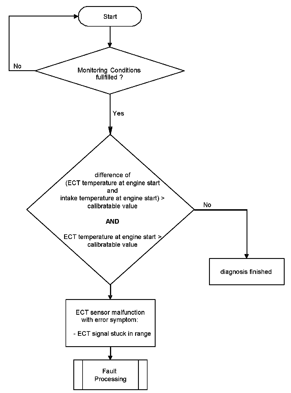 This coolant temperature plausibility diagnosis is performed once per engine run. At low ambient temperature a stuck open thermostat can cause an insufficient engine warm up. In the case that the coolant temperature is lower than the start temperature for coolant thermostat diagnosis a coolant temperature plausibility error will be detected.