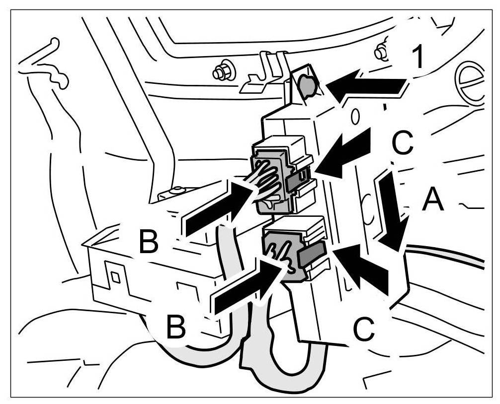 2. Position and push on both plugs -arrows B- until the locking tabs -arrows C- are felt to engage.