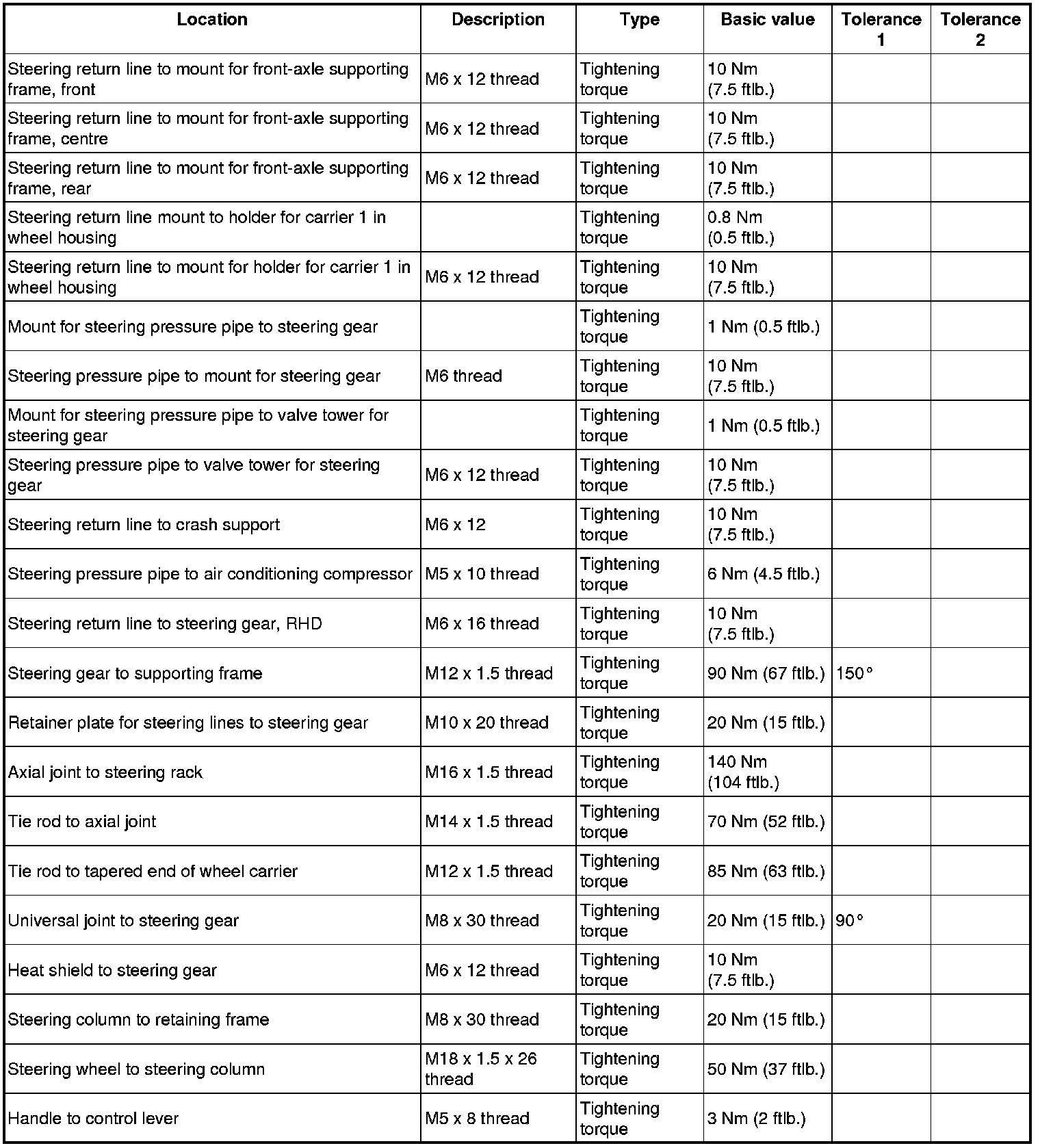 Tightening torques for steering