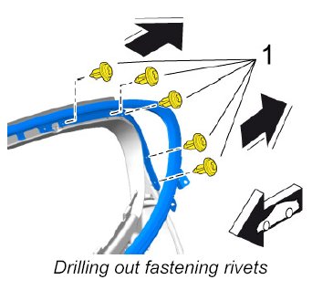 5. Drill out fastening rivets -1- on moulding and remove the remaining pieces of the rivets.