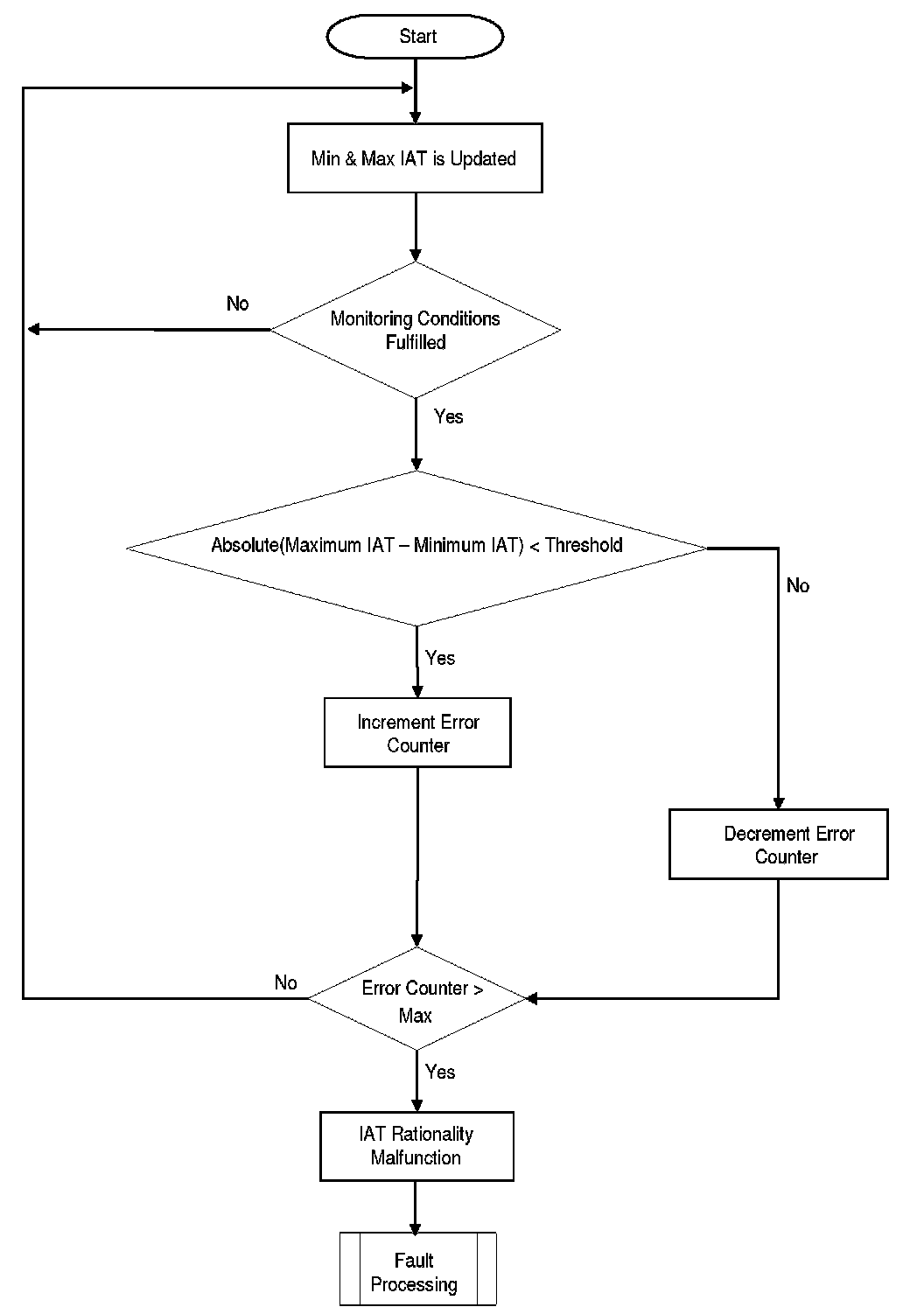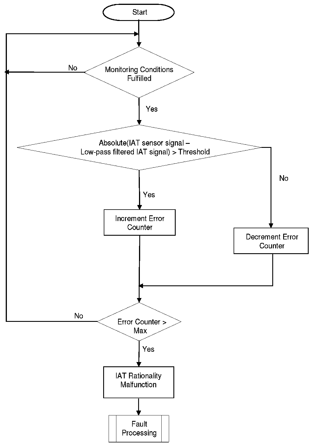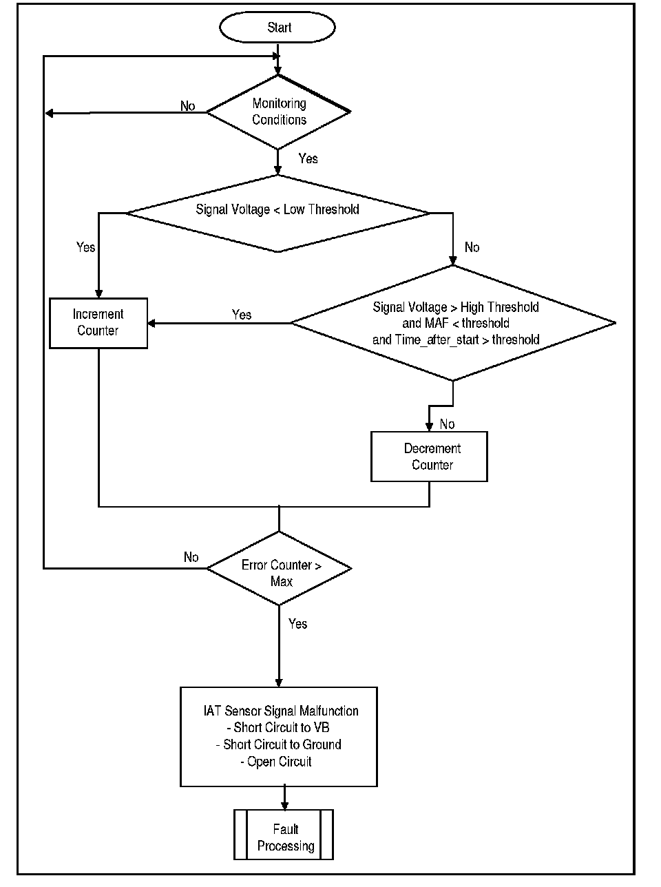 This diagnosis checks IAT for a Stuck signal. If the vehicle was driven for a mini-mum required distance and time-after-start, then the change in the IAT signal during this period should be above a calibrate able threshold. If this is not the case, a stuck IAT signal is detected.
