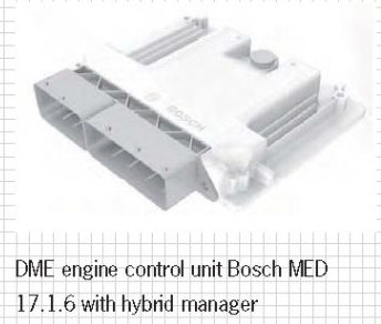 The interaction between the combustion engine, hybrid module (electric motor and decoupler), transmission and battery is controlled during the hybrid-specific driving modes via the hybrid manager. The hybrid manager module is located in the DME control unit Bosch MED 17.1.6 together with the control for the combustion engine.