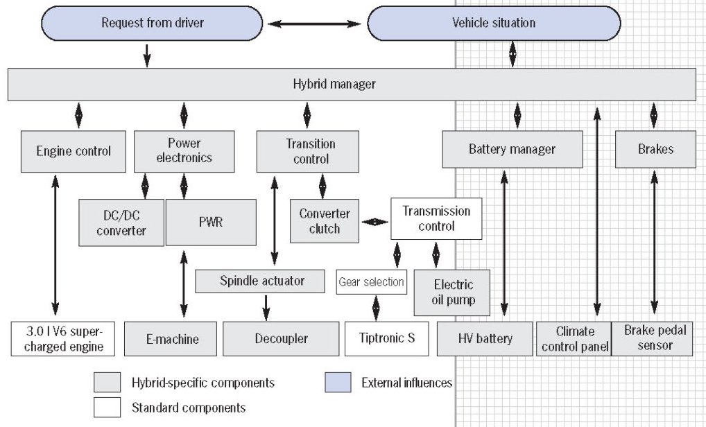 The hybrid manager assists the existing engine control and collects all driving and energy information for the vehicle in order to control the electric motor, combustion engine and all other hybrid components in every driving situation. The hybrid manager uses approx. 20,000 data parameters, whereas around 6,000 are already sufficient for conventional engine control.