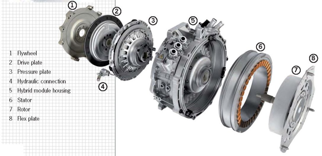 The module consists of a decoupler at the end connected to the combustion engine and the E-machine, which transmits power to the transmission via the flex plate. The rotor on the electric motor with flex plate connects the hybrid module at the transmission end to the converter on the 8 speed automatic transmission. While the components on the electric motor can only be replaced as a complete unit, the components on the decoupler, flywheel, drive plate and pressure plate can be replaced individually.