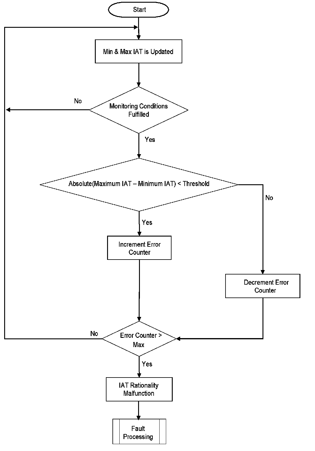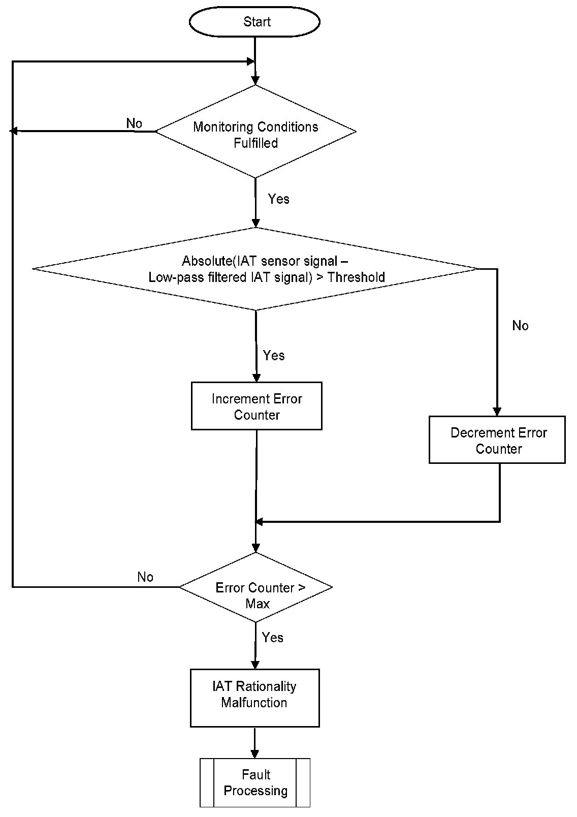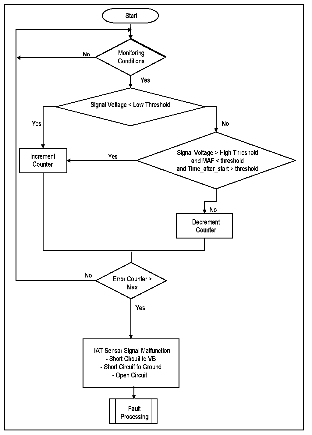 This diagnosis checks IAT for a Stuck signal. If the vehicle was driven for a mini-mum required distance and time-after-start, then the change in the IAT signal during this period should be above a calibrate able threshold. If this is not the case, a stuck IAT signal is detected.