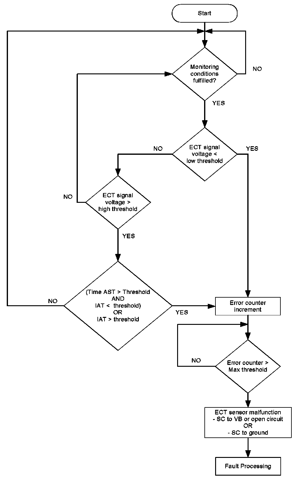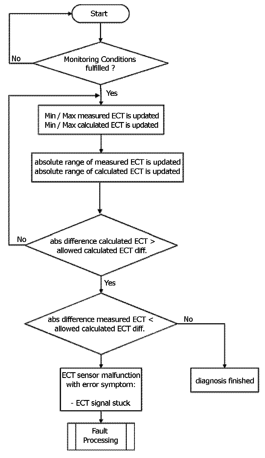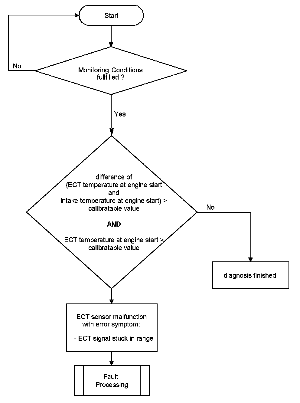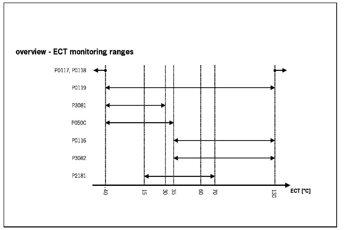 This coolant temperature plausibility diagnosis is performed once per engine run. At low ambient temperature a stuck open thermostat can cause an insufficient engine warm up. In the case that the coolant temperature is lower than the start temperature for coolant thermostat diagnosis a coolant temperature plausibility error will be detected.