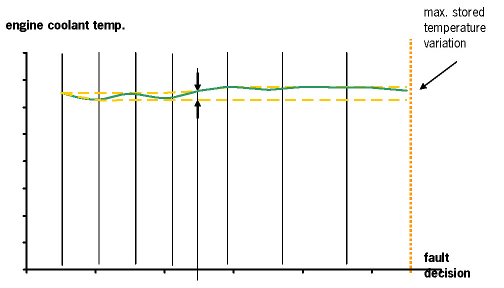 The purpose of this diagnosis is to detect a stuck coolant temperature signal. The diagnostic function checks if after a variation of the calculated coolant temperature also a variation of the measured coolant temperature is detected.