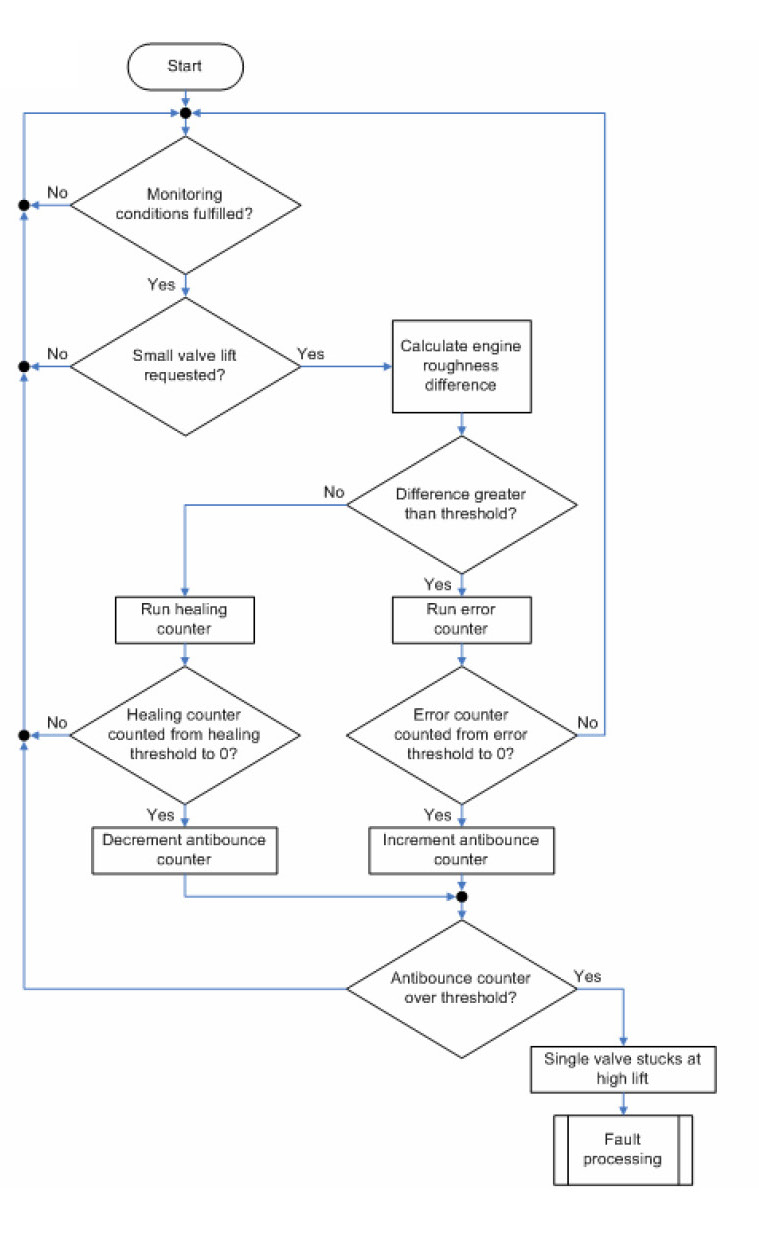 This diagnosis monitors whether a single inlet valve stuck at the high valve lift. This disturbs the gas exchange process of the concerned cylinder. The engine speed roughness of this cylinder changes. The difference of this engine roughness and of the roughness of a reference cylinder, e.g. the proceeding cylinder or the cylinder 360 °CA before) is taken for the monitoring. If this difference exceeds a threshold for a certain time the failure is detected.
