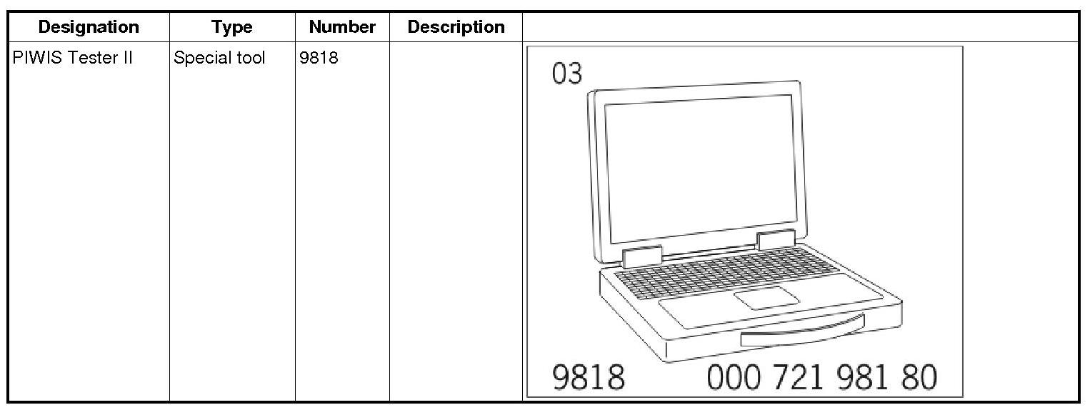 The procedure described here has been structured in general terms. Different text or additional information may appear in PIWIS Tester II 9818.