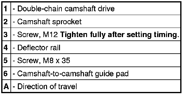 1. Remove top guide rails (guide pad) between the camshafts if you have not already done so -6-.