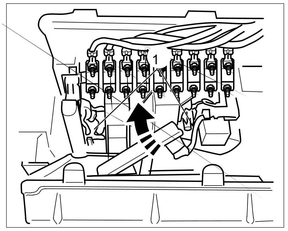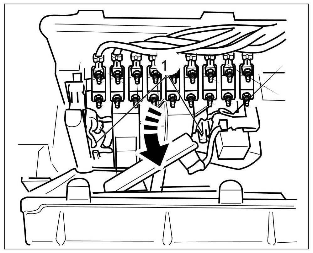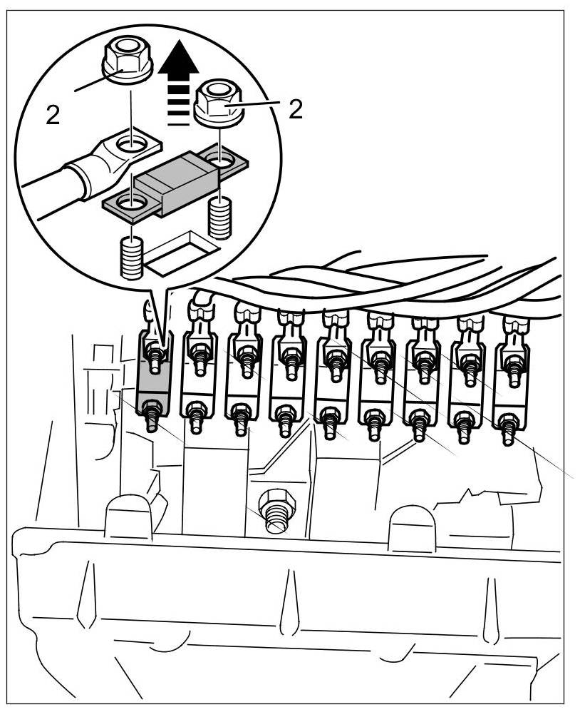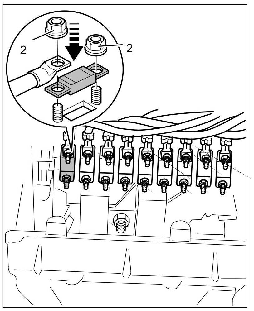 6. Secure the fuse element with new fastening nuts -2-. => Tightening torque: 5 Nm (3.5 ftlb.).