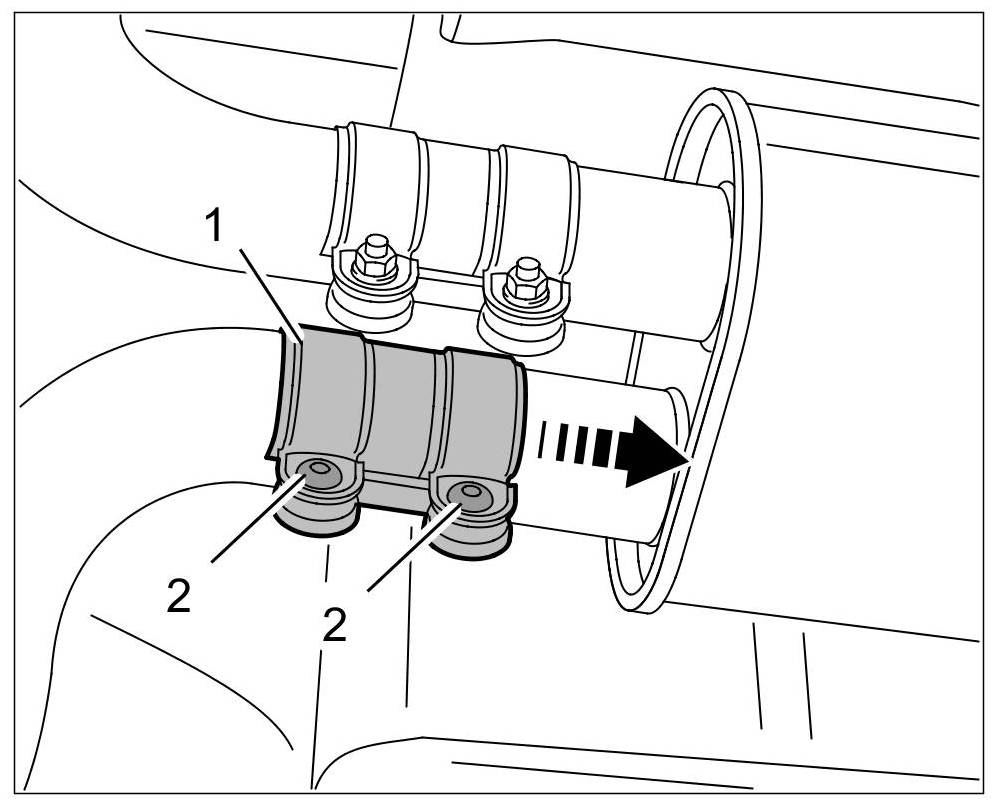 8. Loosen clamping sleeves -1- for the exhaust pipe.