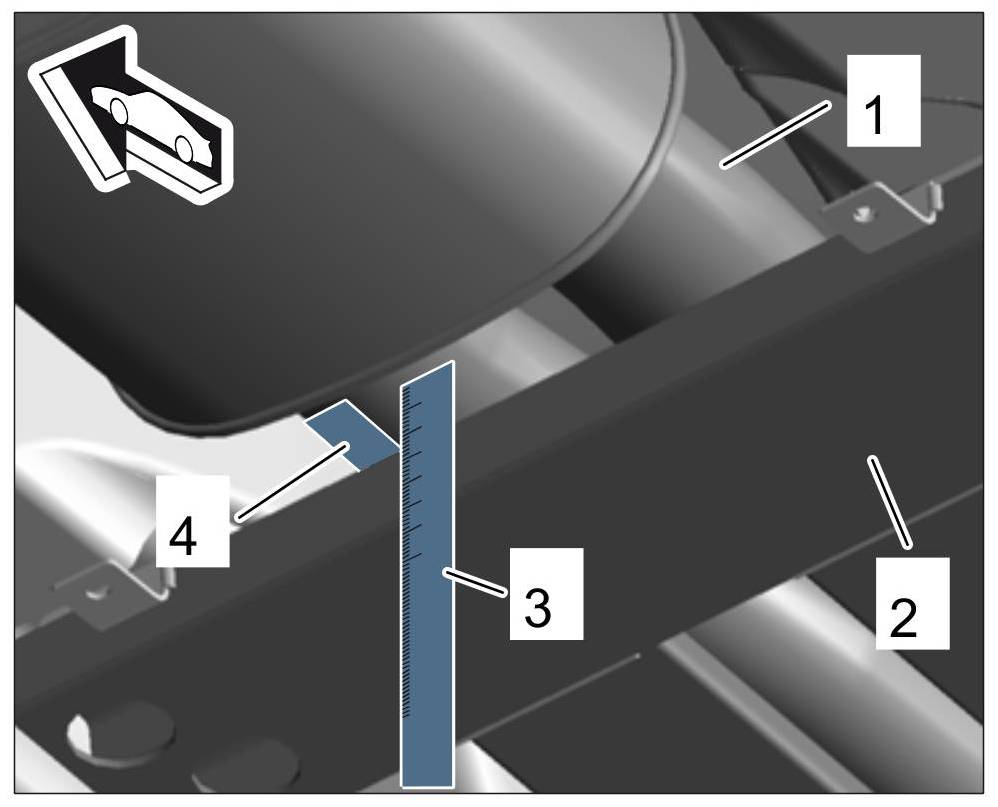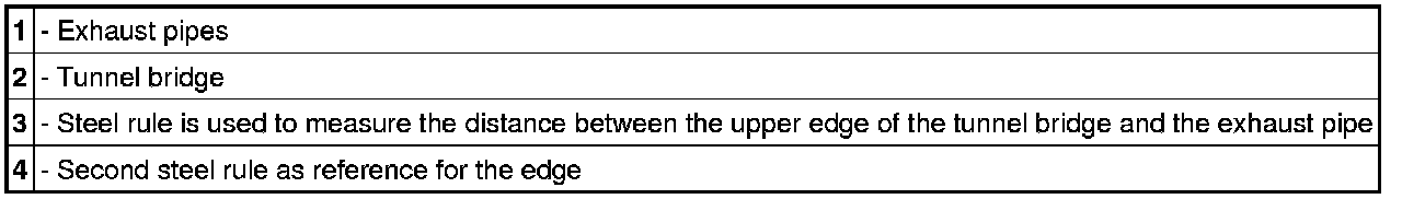 10.1. Place a steel rule between the upper edge of the tunnel bridge and the exhaust pipe. Minimum distance: 15 mm. The distance must never be less than this value (risk of contact and humming noises). Optimum distance: 17 to 20 mm.