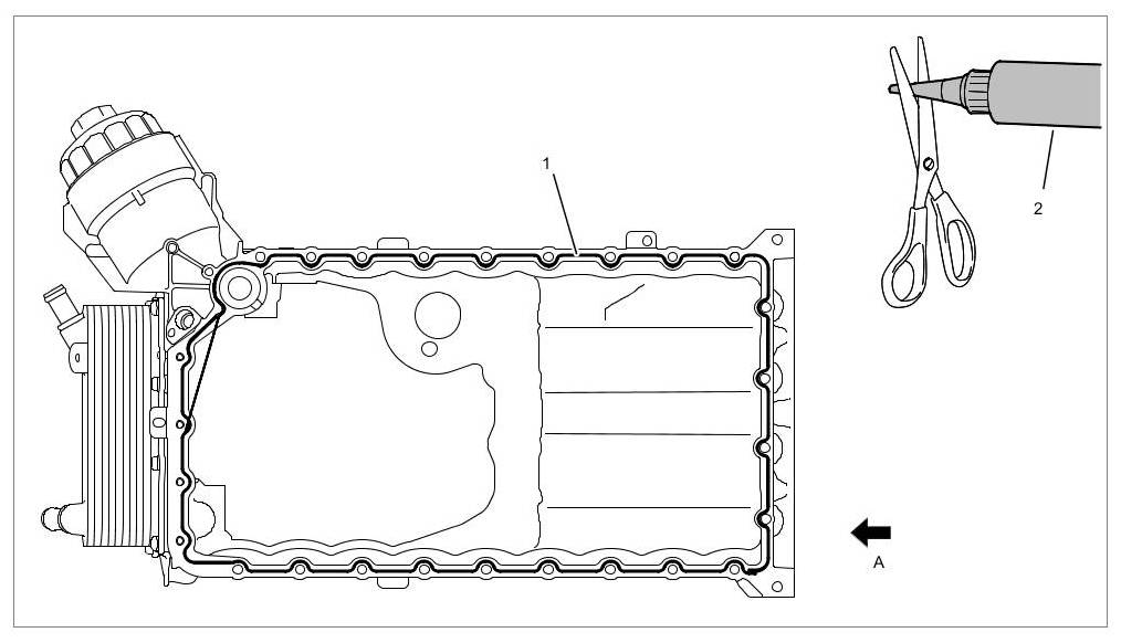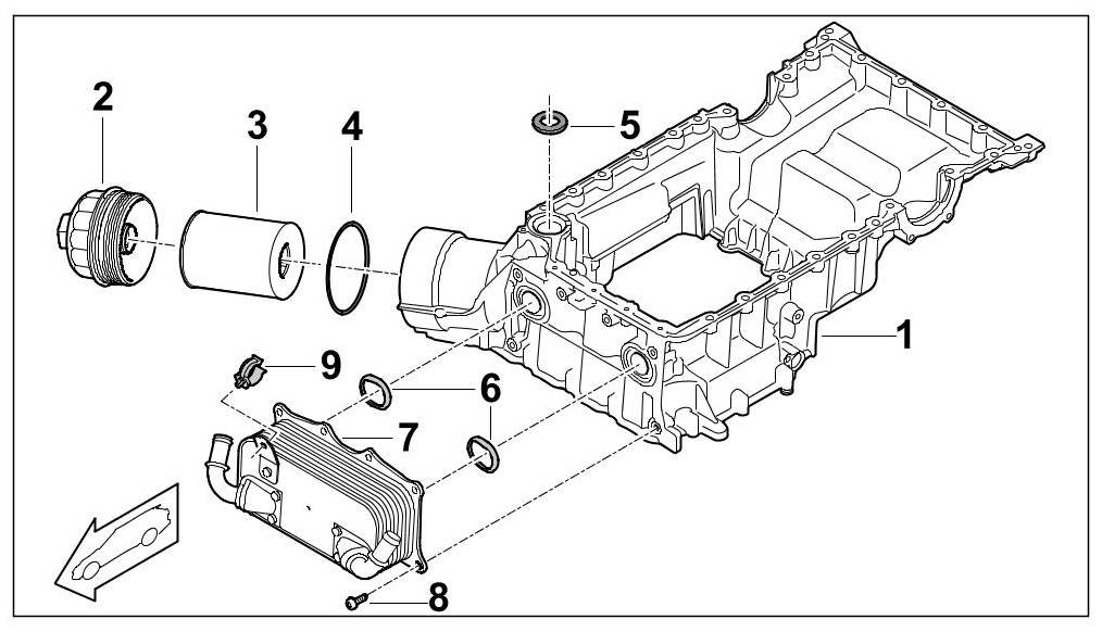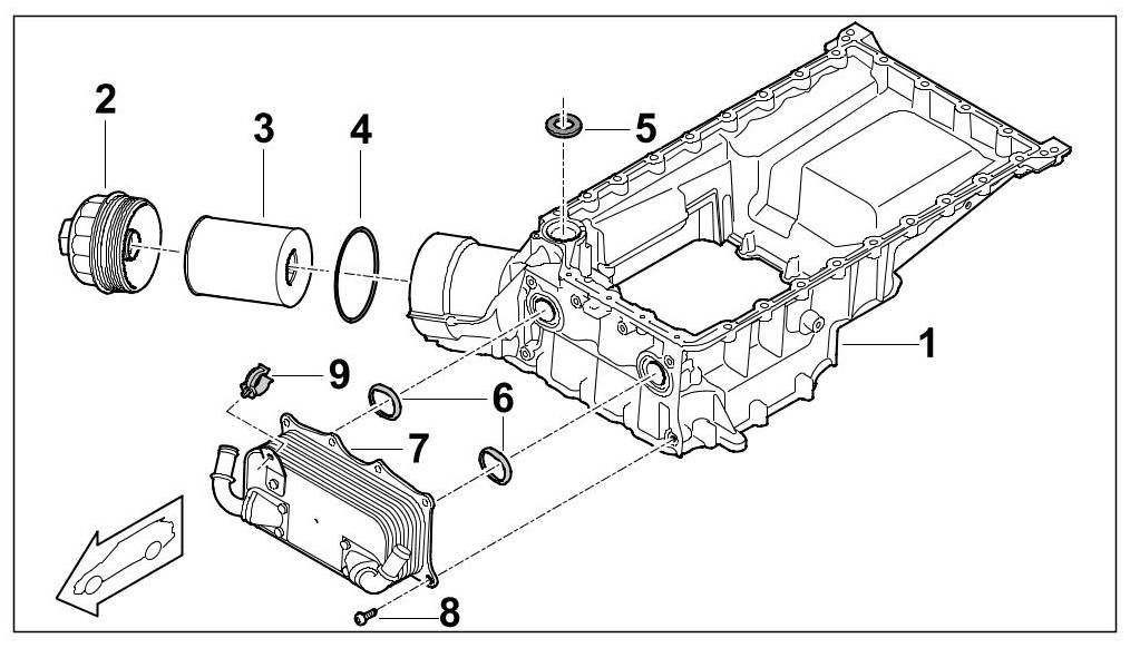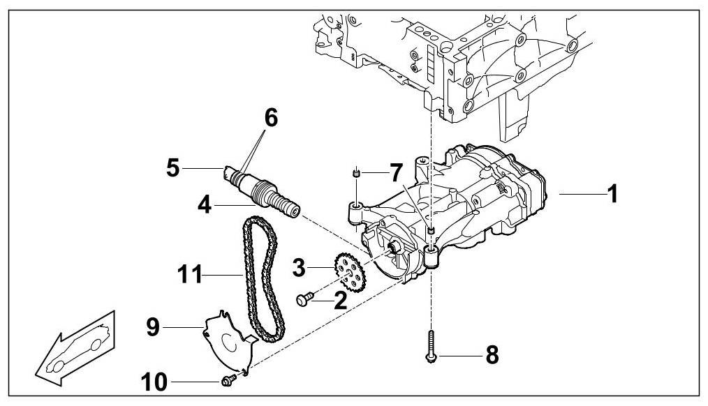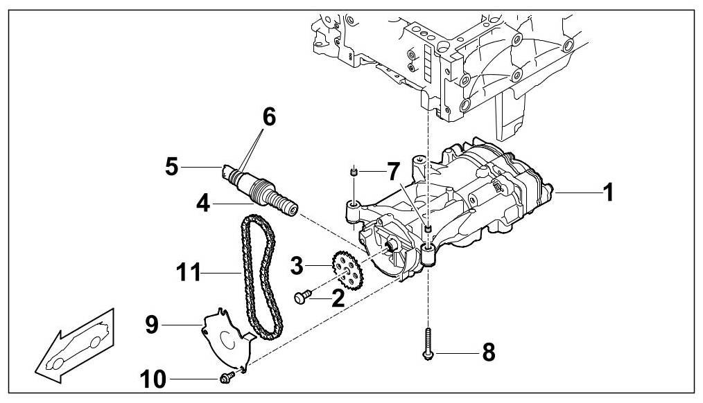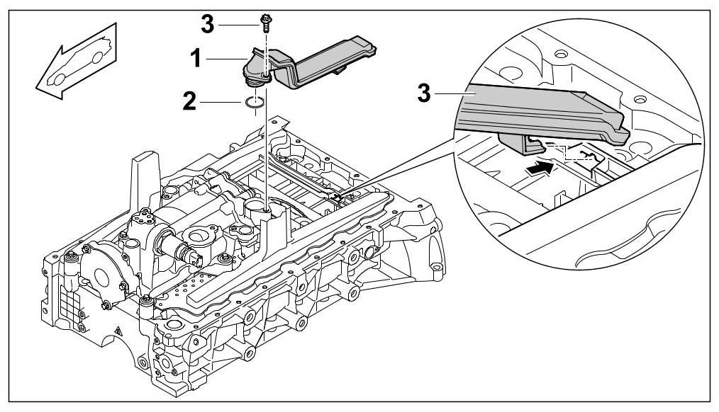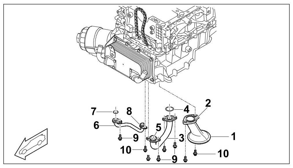 Oil lines, naturally aspirated engine, view with oil pan removed