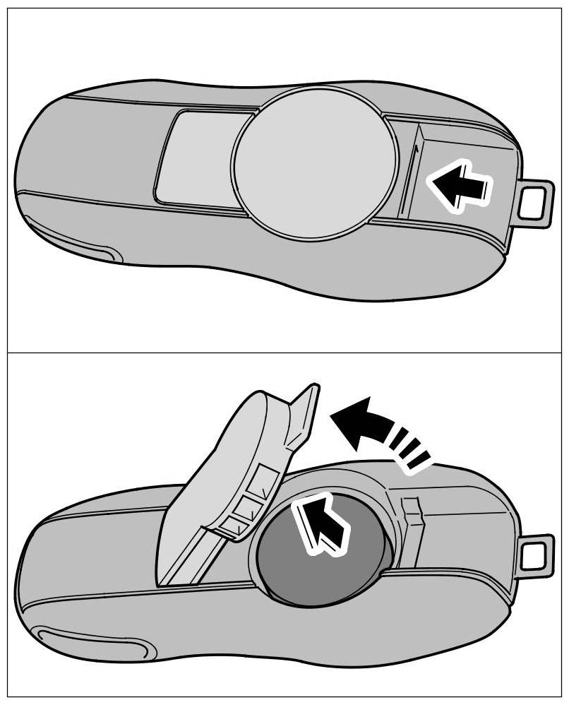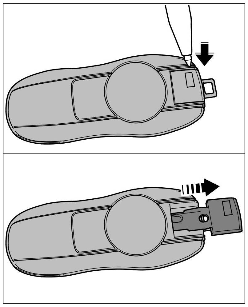 1. Release locking mechanism -arrow- and pull emergency key out of the remote control -arrow-.