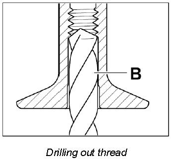 Drill out old thread as far as the base of the thread using a drill bit contained in the M10 or M14 kit B.