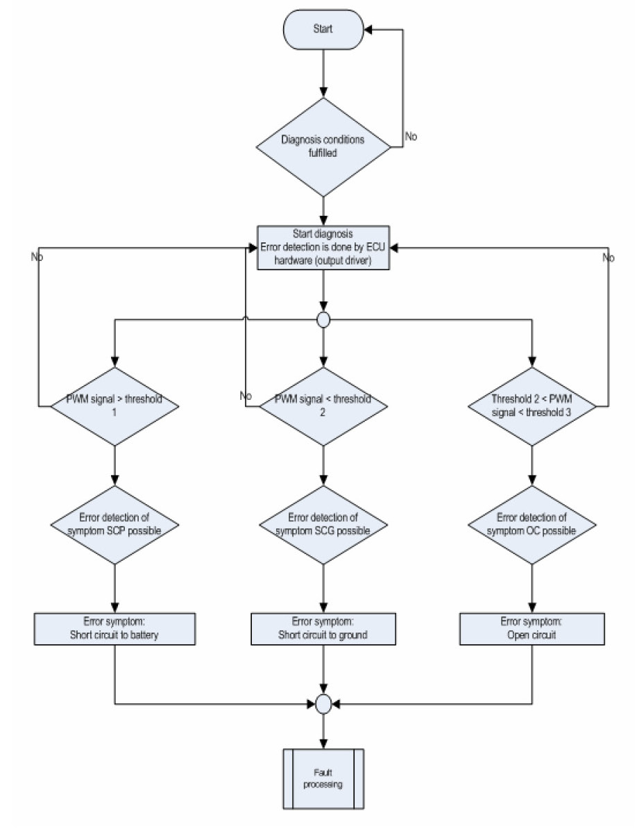 The PWM signal is compared with an upper and lower limit to detect cable interruption and short circuits.