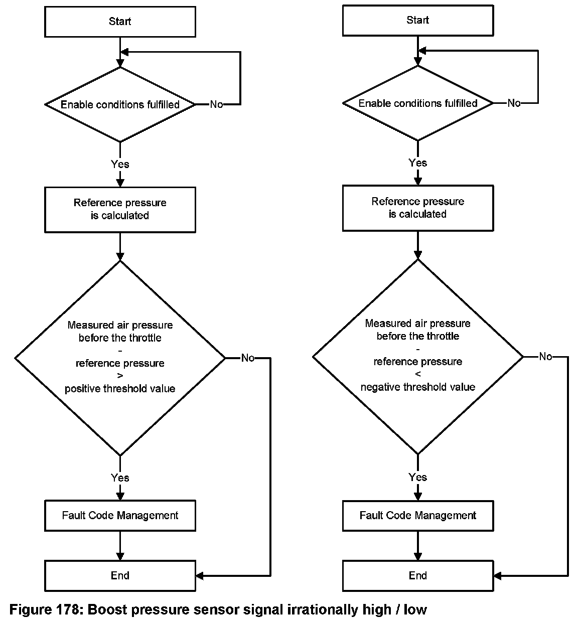 When the enable conditions are fulfilled, the monitor is started. If the absolute value of the difference between the two intake manifold temperature values (measured intake manifold temperature bank 1 - measured intake manifold temperature bank 2) is greater than a threshold value, the fault "Intake manifold temperature, deviation between the measurement values too high" is detected.