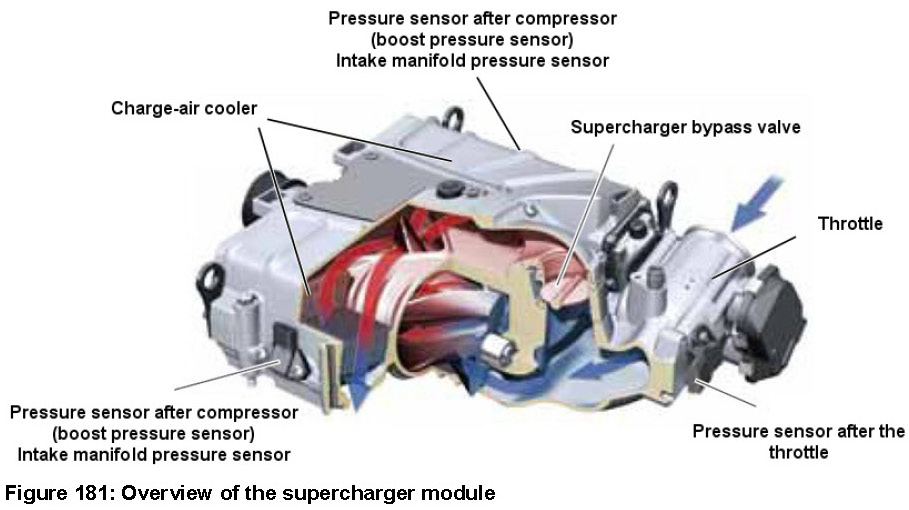 The supercharger output is controlled by the position of the supercharger bypass valve. When the bypass valve is closed, the taken-in air mass completely flows into the compressor. When the supercharger bypass valve is open, the air is conducted through a bypass around the compressor. In order to monitor the pressures and temperatures of the supercharger module, one sensor before the compressor and two sensors after the compressor (one sensor per bank) are used.