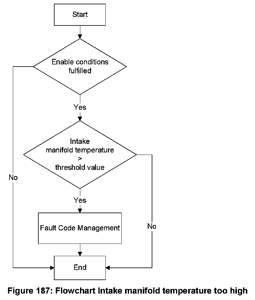 When the enable conditions are fulfilled, the monitor is started. If the measured intake manifold temperature exceeds a threshold value, the fault "Intake manifold temperature too high" is detected.
